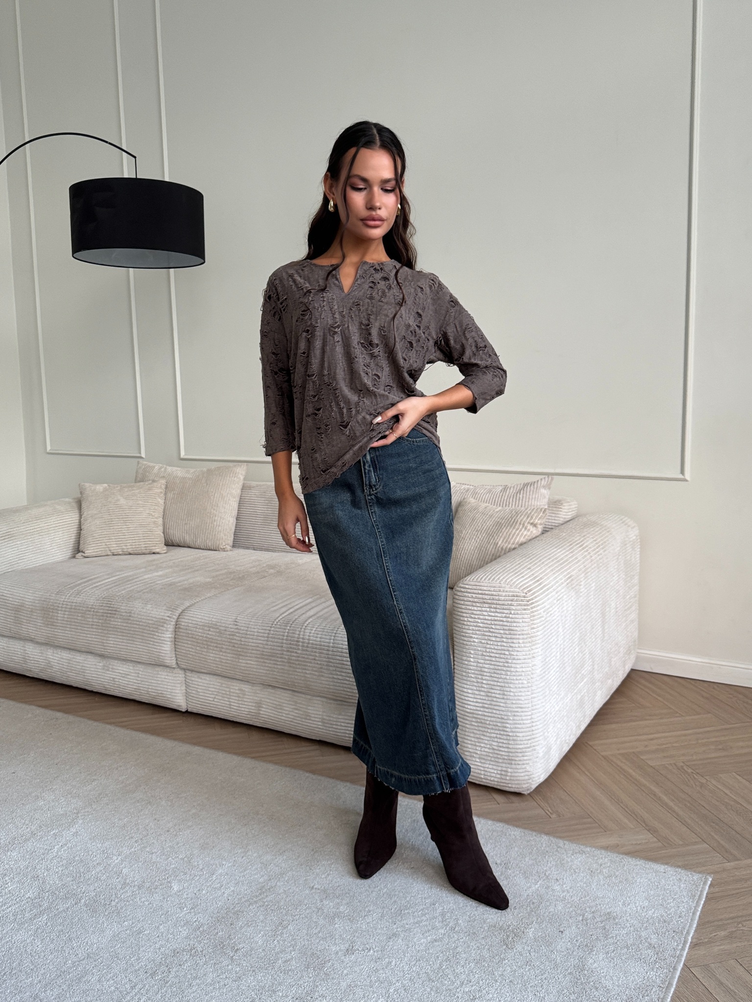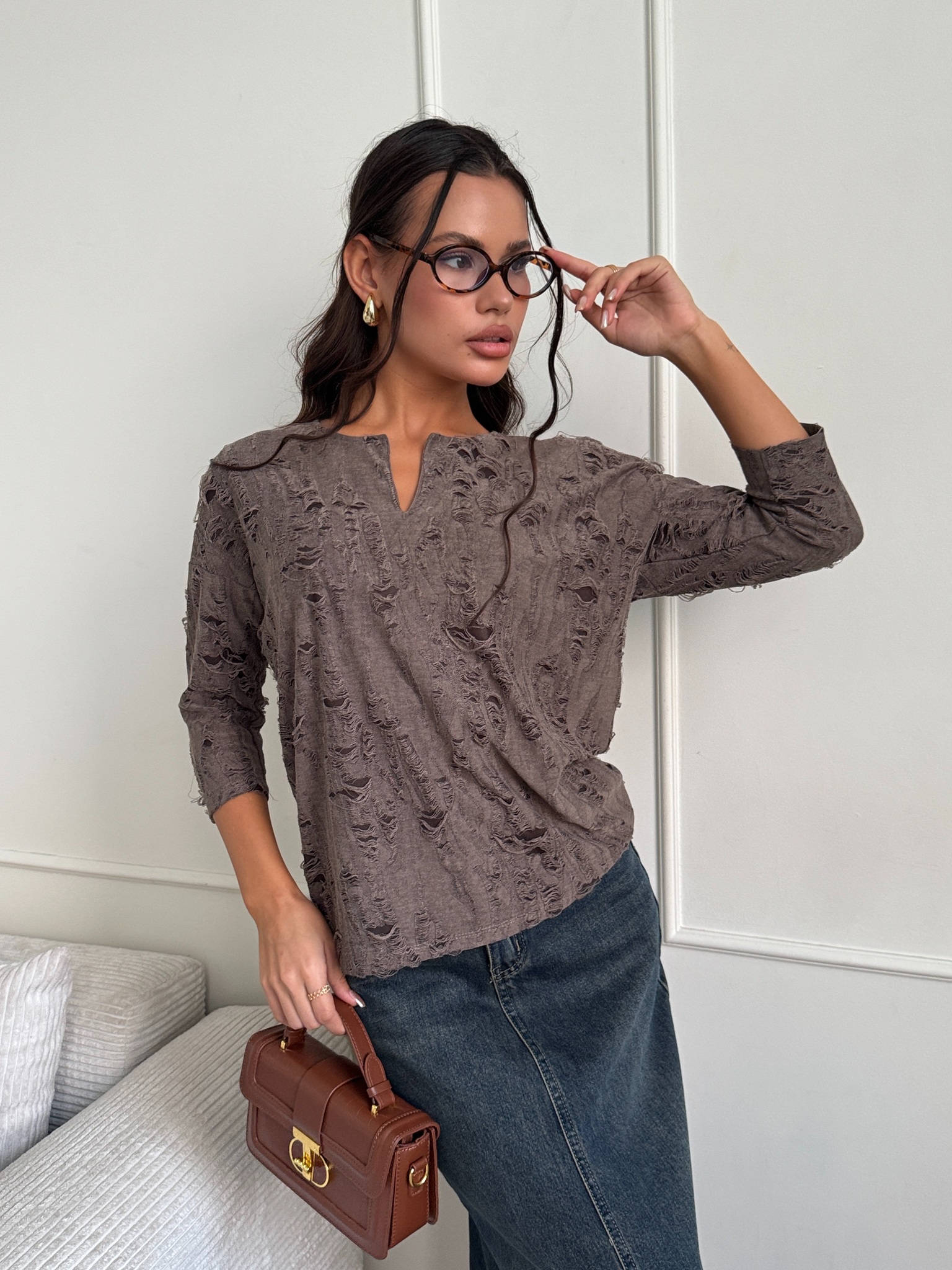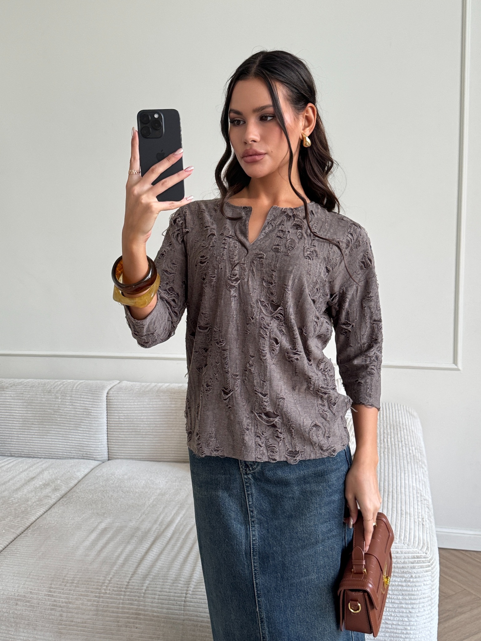 Стильный базовый лонгслив UVOSTORE (произведено в Москве) из приятного к коже премиального турецкого трикотажа с выразительной фактурой и «рваным» эффектом — это именно декоративная текстура, без дырок. Свободный силуэт и рукав 3/4 обеспечивают комфорт и лёгкость движений, круглая горловина с аккуратным разрезом визуально вытягивает шею.