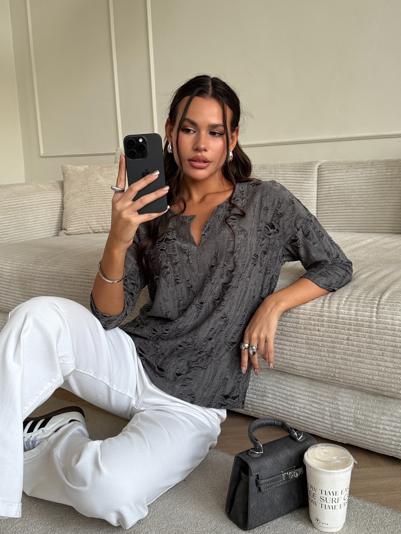 Стильный базовый лонгслив UVOSTORE (произведено в Москве) из приятного к коже премиального турецкого трикотажа с выразительной фактурой и «рваным» эффектом — это именно декоративная текстура, без дырок. Свободный силуэт и рукав 3/4 обеспечивают комфорт и лёгкость движений, круглая горловина с аккуратным разрезом визуально вытягивает шею.