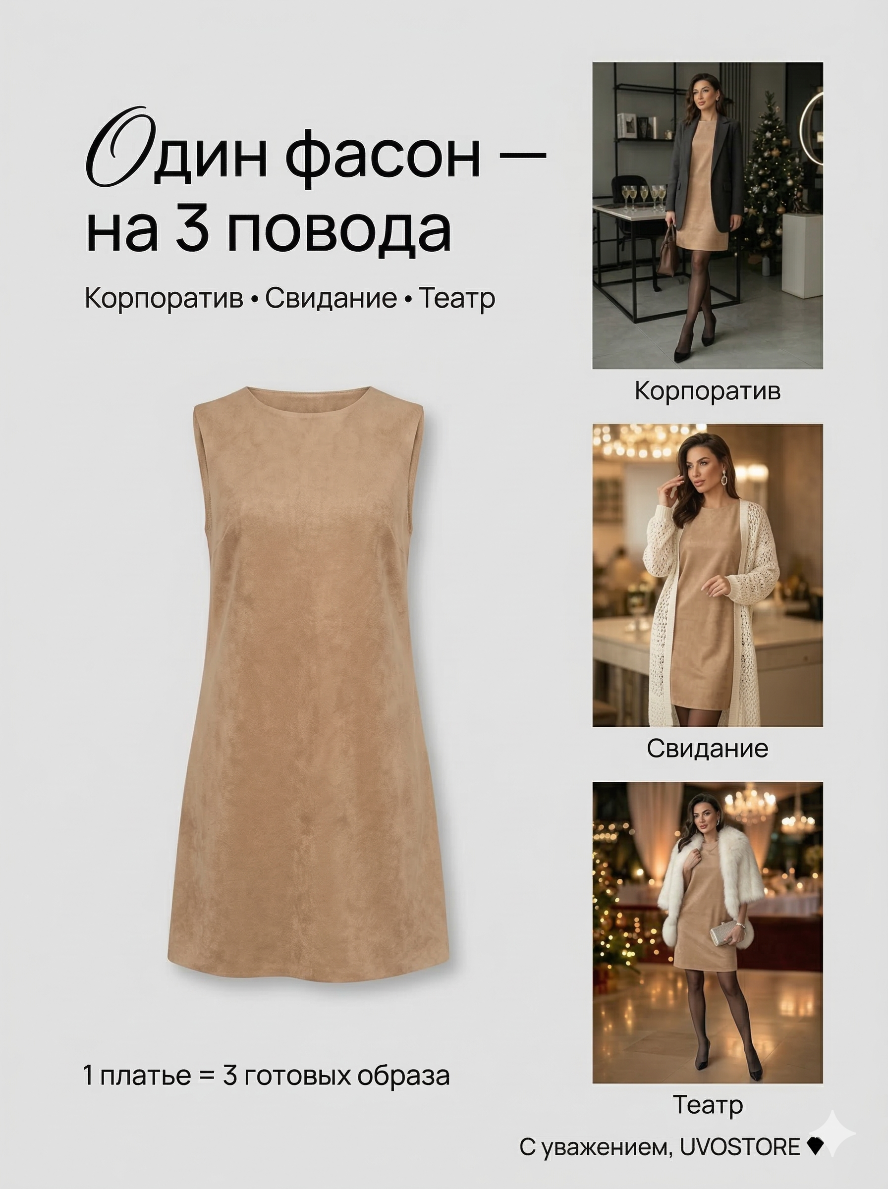 Эта модель подойдет тем, кто ищет бежевое женское платье без рукавов, бежевый сарафан или удобное платье-сарафан для офиса. Платье выглядит сдержанно, современно и женственно, поэтому помогает создать аккуратный образ без лишней перегруженности.