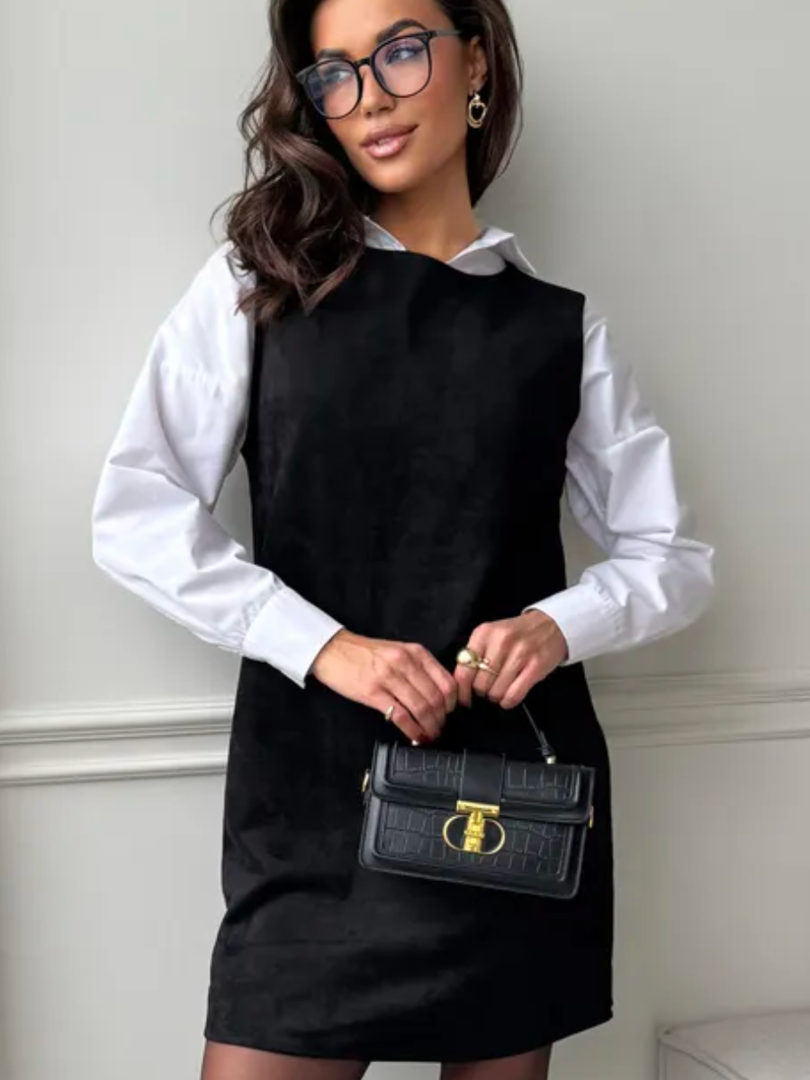 Черное женское платье-сарафан из экозамши — универсальная модель для офиса, города и образов на каждый день. Лаконичный крой и базовый черный цвет позволяют легко вписать его в повседневный гардероб. Это платье можно носить как самостоятельную вещь или сочетать с рубашкой, блузкой, водолазкой и жакетом.