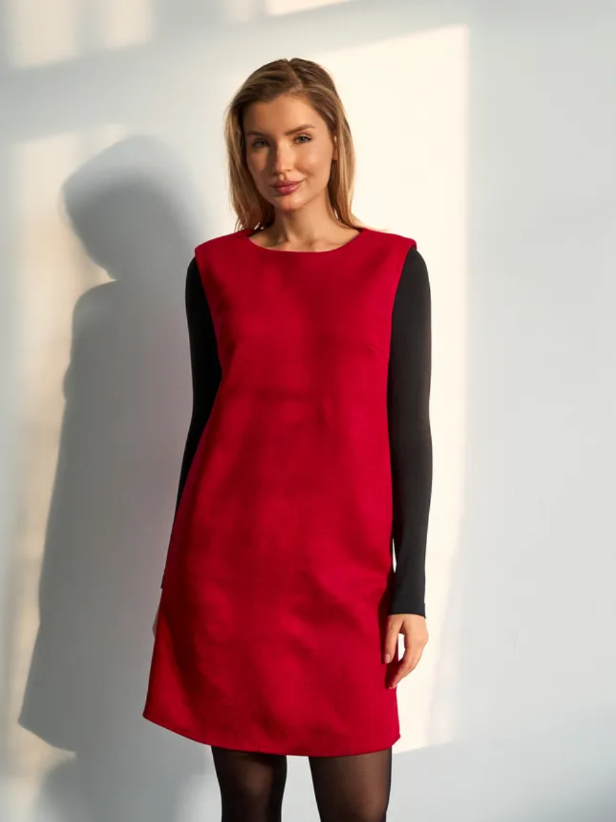 Красное женское платье-сарафан из экозамши с черными боковыми вставками — выразительная модель для офиса, города и образов на каждый день. Контраст красного цвета и черных боковых вставок делает силуэт более графичным и визуально вытянутым, поэтому платье выглядит женственно, современно и собранно.