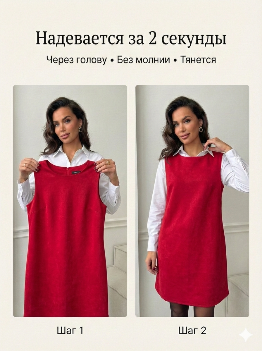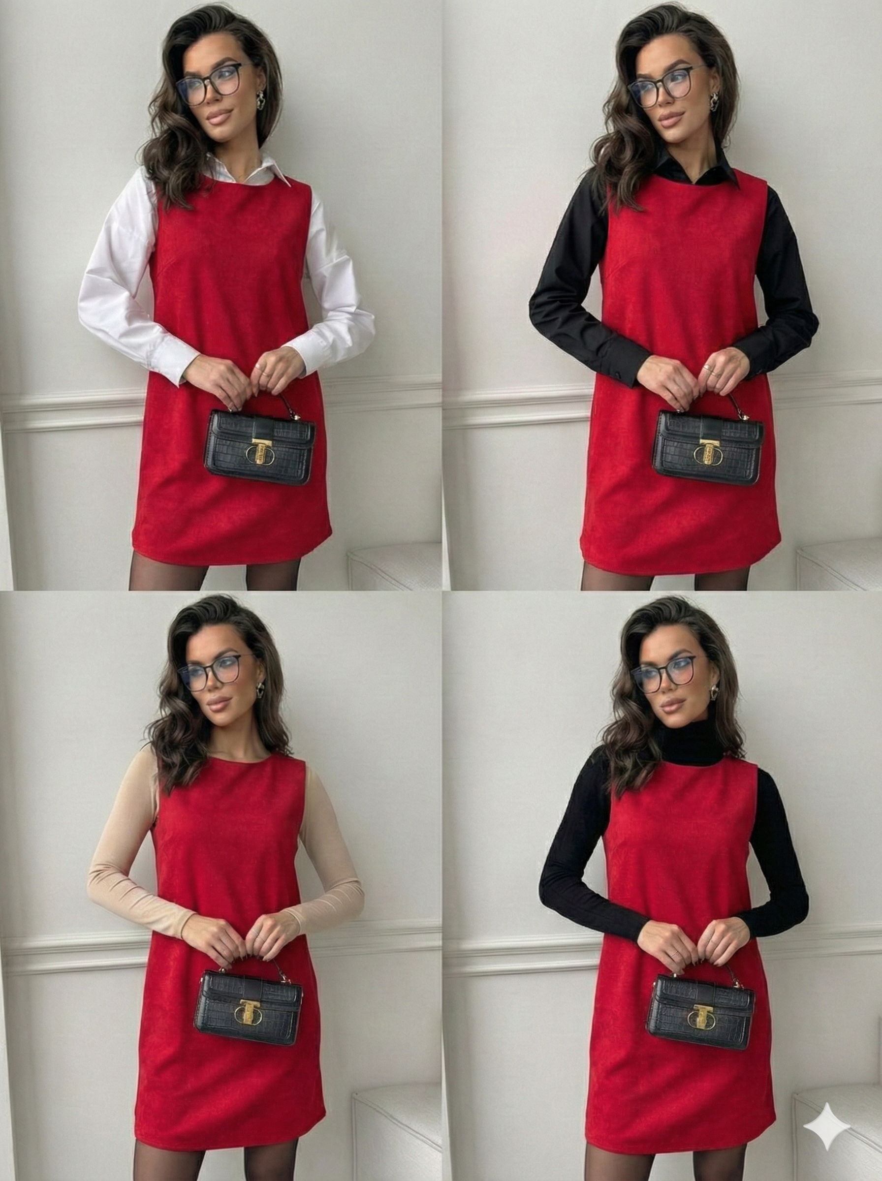 Сарафан выполнен из качественной экозамши: выглядит как натуральная, хорошо держит форму, слегка тянется — удобно надевать и носить весь день. Подходит для высоких и невысоких, длина зависит от роста и выбранного размера: на разном росте изделие может выглядеть как мини или длина до колена. Ориентируйтесь по таблице размеров и своим объемам (ОГ/ОТ/ОБ и длина изделия).