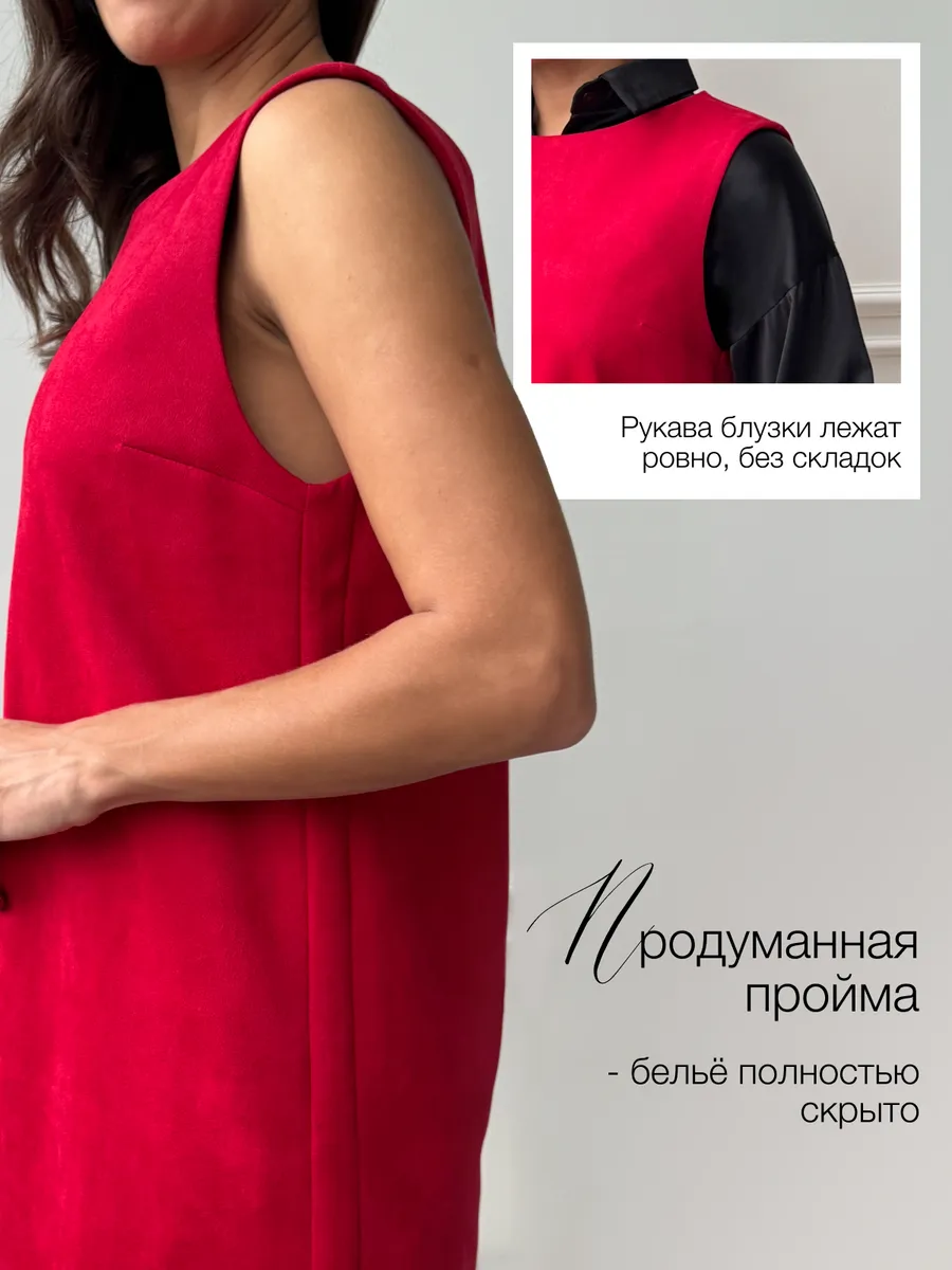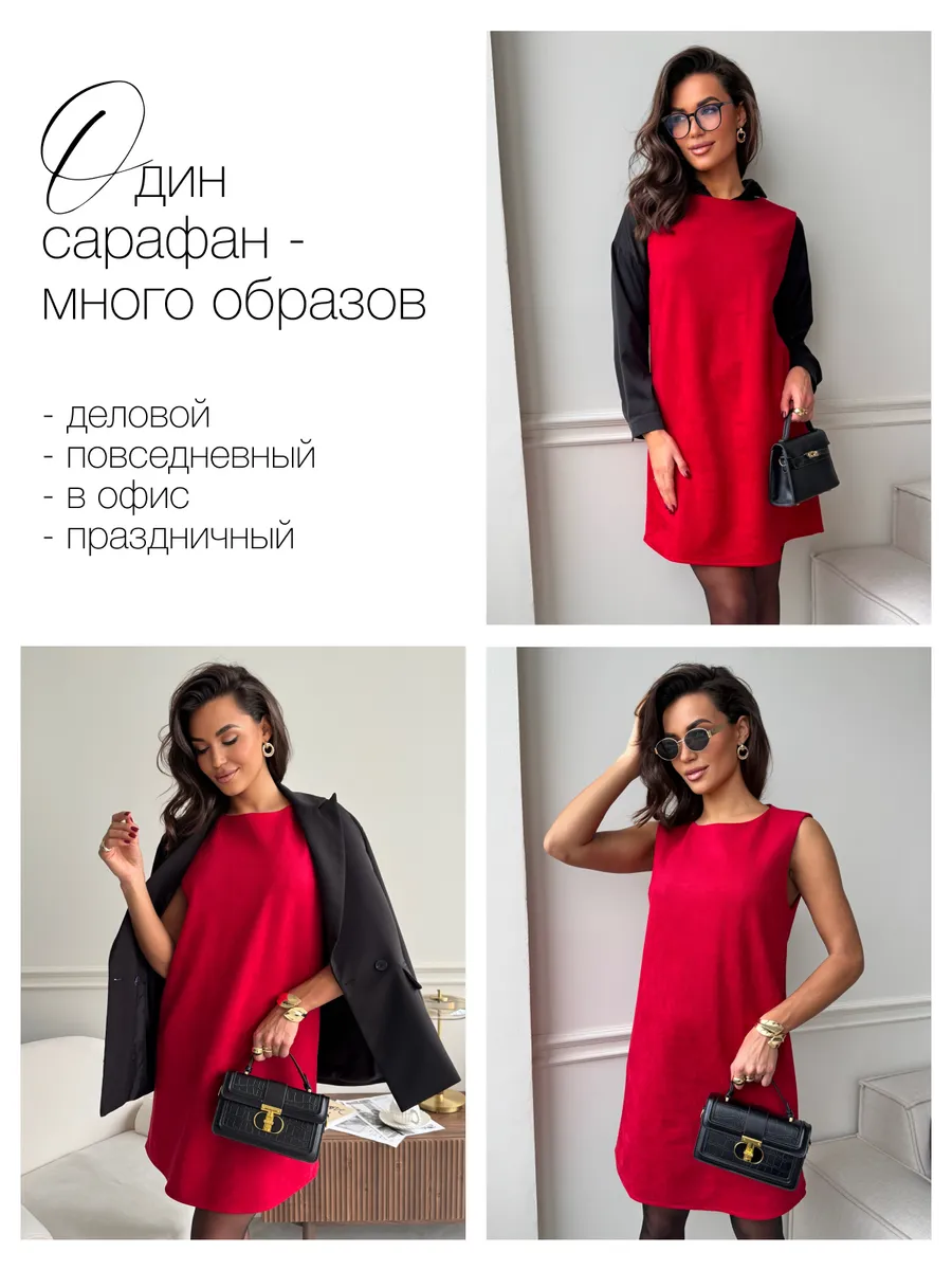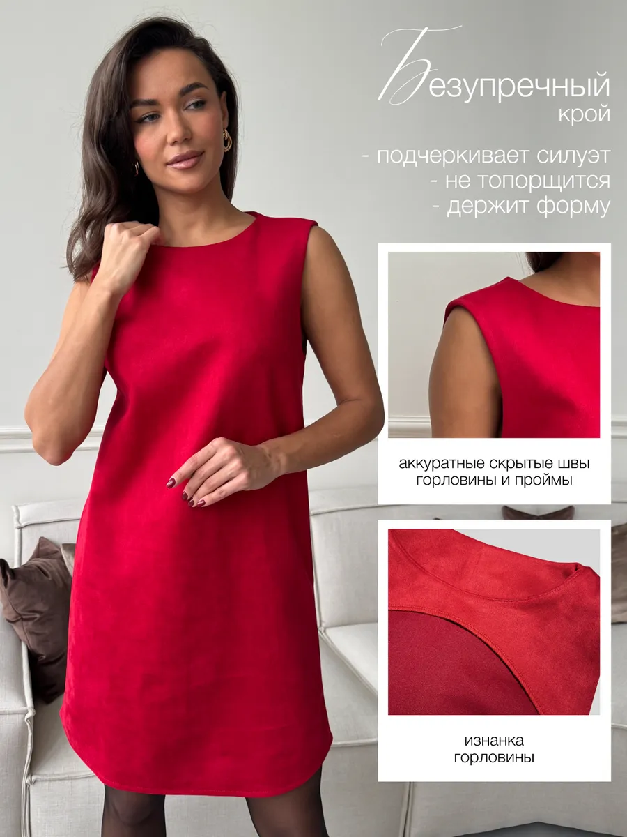 Тот самый сарафан – стильное замшевое платье сарафан без рукавов с открытыми плечами — универсальное женское платье для учебы и офиса, встреч и корпоративов, повседневных и праздничных выходов, составления капсульных сетов. Благодаря продуманному свободному крою деловое платье-сарафан с лёгким А-силуэтом «трапеция» комфортно сидит на фигуре и подчёркивает достоинства. Модель подходит как для высоких, так и для невысоких девушек, а длина может выглядеть как мини или как мягкое миди ниже колена в зависимости от размера. Идеальный выбор для зимнего и весеннего сезона 2026 года.