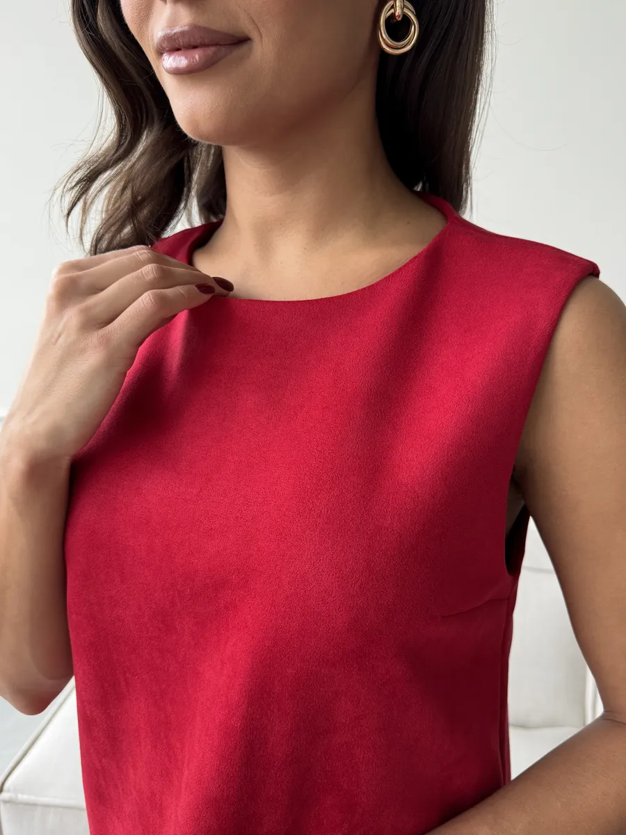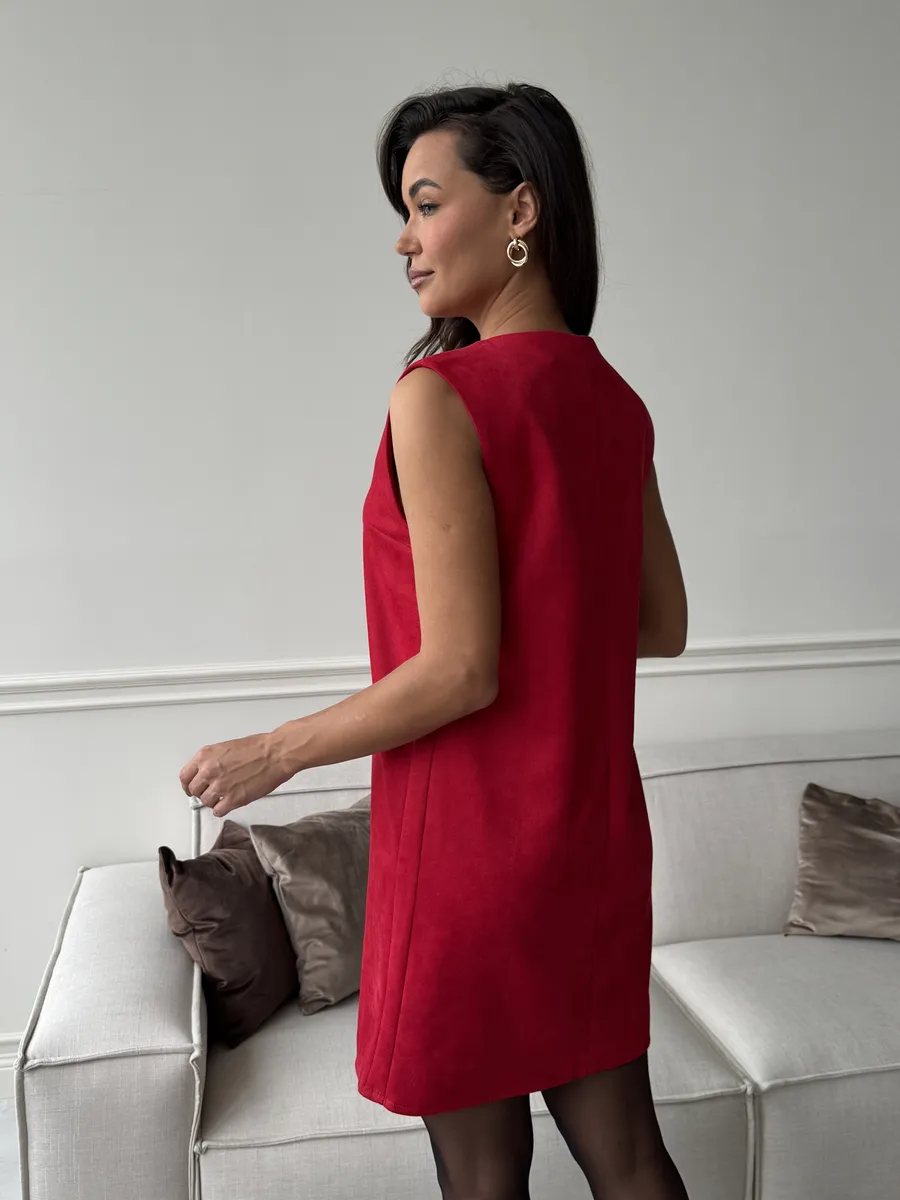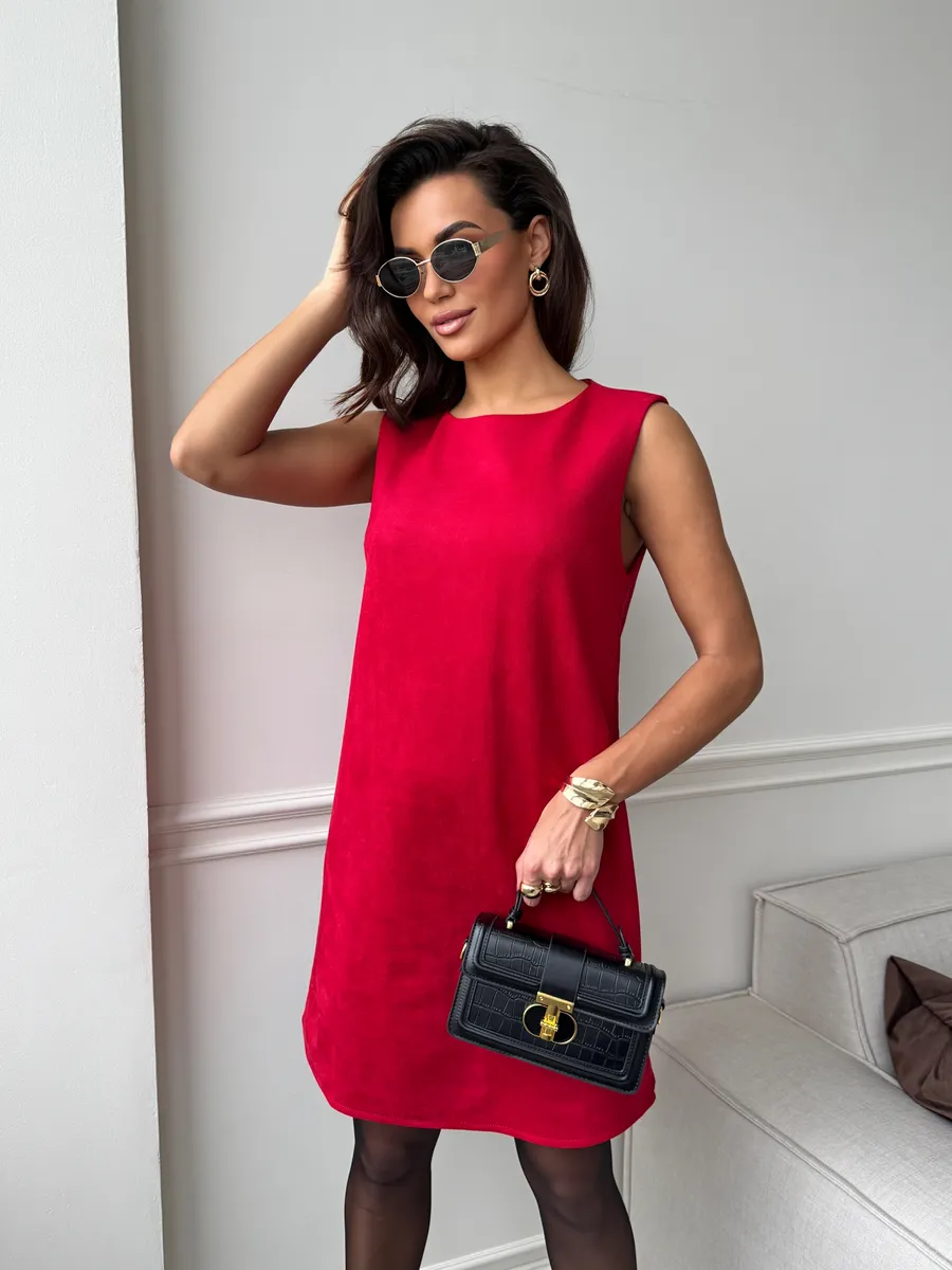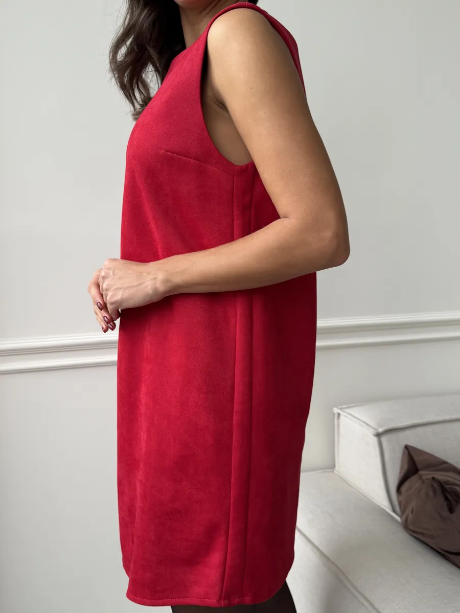Тот самый сарафан – стильное замшевое платье сарафан без рукавов с открытыми плечами — универсальное женское платье для учебы и офиса, встреч и корпоративов, повседневных и праздничных выходов, составления капсульных сетов. Благодаря продуманному свободному крою деловое платье-сарафан с лёгким А-силуэтом «трапеция» комфортно сидит на фигуре и подчёркивает достоинства. Модель подходит как для высоких, так и для невысоких девушек, а длина может выглядеть как мини или как мягкое миди ниже колена в зависимости от размера. Идеальный выбор для зимнего и весеннего сезона 2026 года.