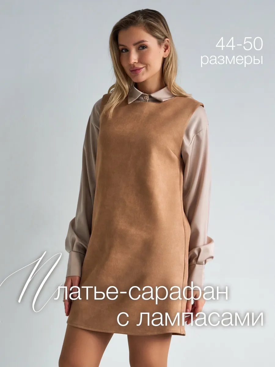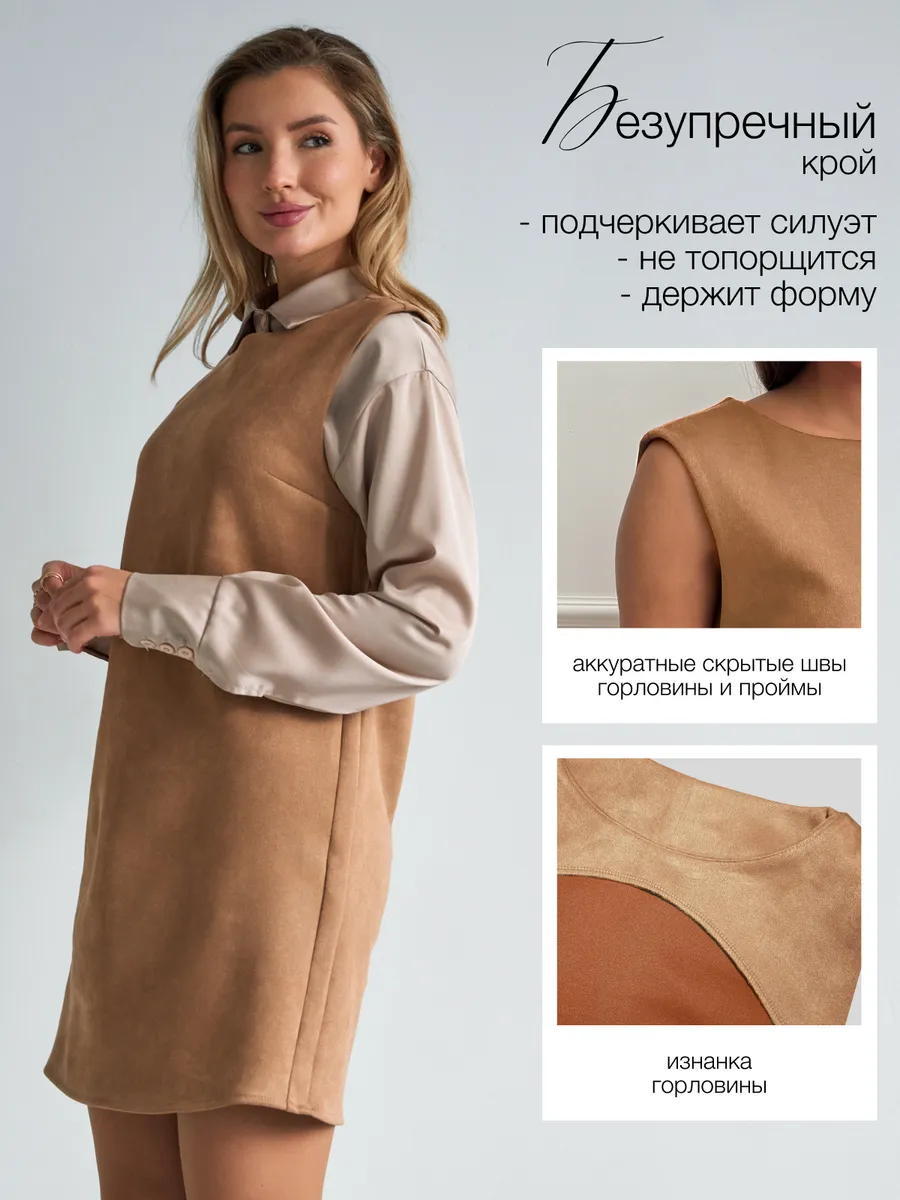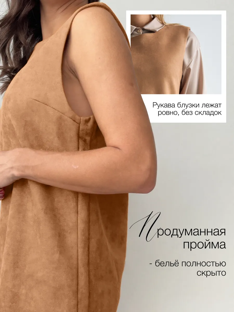 Тот самый сарафан – стильное замшевое платье сарафан без рукавов с открытыми плечами — универсальное женское платье для учебы и офиса, встреч и корпоративов, повседневных и праздничных выходов, составления капсульных сетов. Благодаря продуманному свободному крою деловое платье-сарафан с лёгким А-силуэтом «трапеция» комфортно сидит на фигуре и подчёркивает достоинства. Модель подходит как для высоких, так и для невысоких девушек, а длина может выглядеть как мини или как мягкое миди ниже колена в зависимости от размера. Идеальный выбор для зимнего и весеннего сезона 2026 года.
