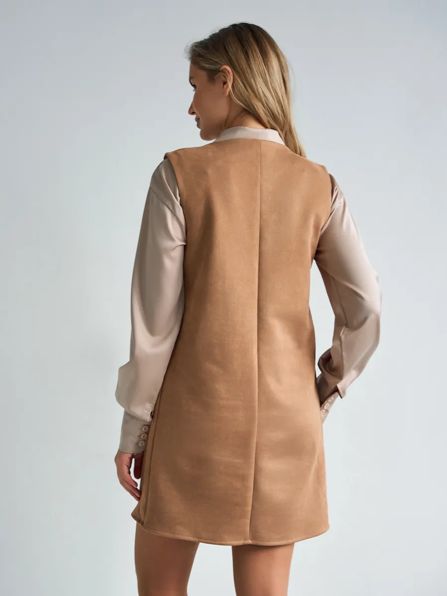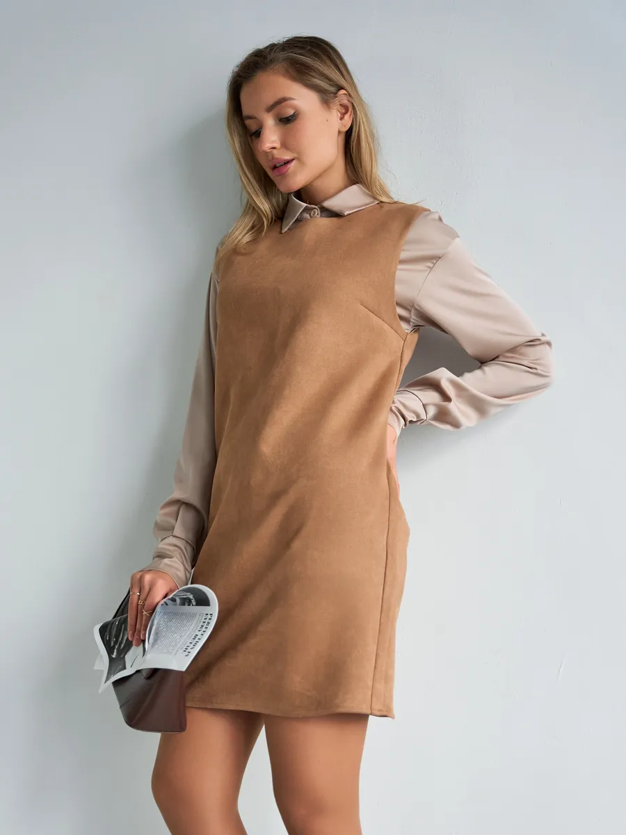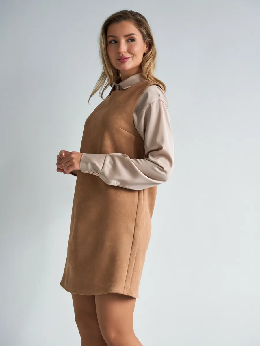 Тот самый сарафан – стильное замшевое платье сарафан без рукавов с открытыми плечами — универсальное женское платье для учебы и офиса, встреч и корпоративов, повседневных и праздничных выходов, составления капсульных сетов. Благодаря продуманному свободному крою деловое платье-сарафан с лёгким А-силуэтом «трапеция» комфортно сидит на фигуре и подчёркивает достоинства. Модель подходит как для высоких, так и для невысоких девушек, а длина может выглядеть как мини или как мягкое миди ниже колена в зависимости от размера. Идеальный выбор для зимнего и весеннего сезона 2026 года.