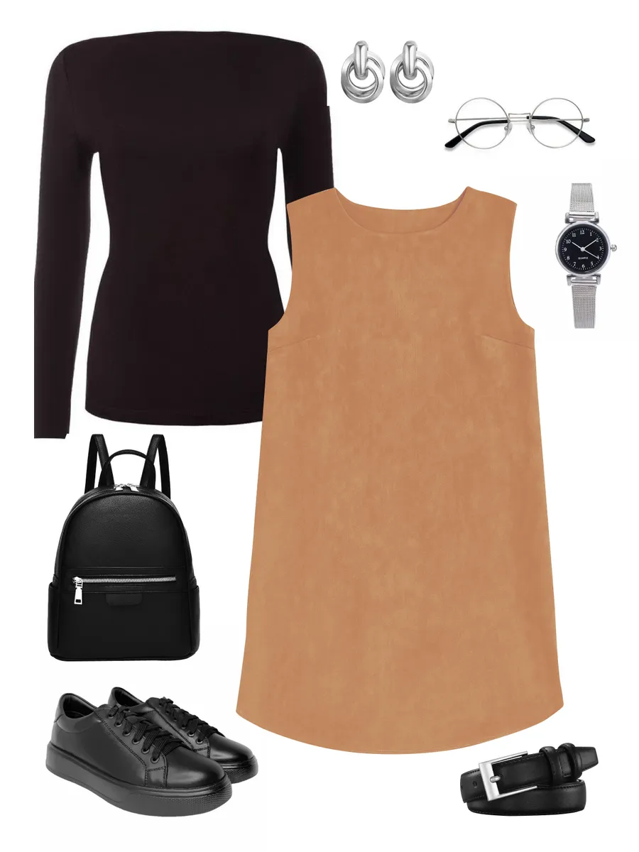 Сарафан офисный можно носить соло как классическое лаконичное платье или сочетать с футболками, водолазками, рубашками и пиджаками для создания многослойных образов. Если нужно подчеркнуть талию, силуэт легко изменить ремнём — образ становится более женственным и выразительным. В тёплом замшевом сарафане комфортно в холодное время года.
