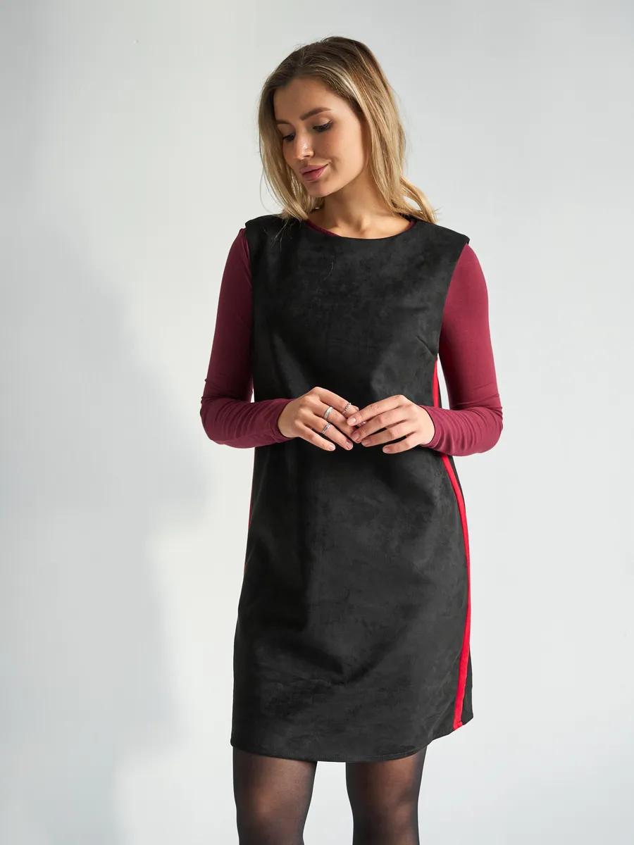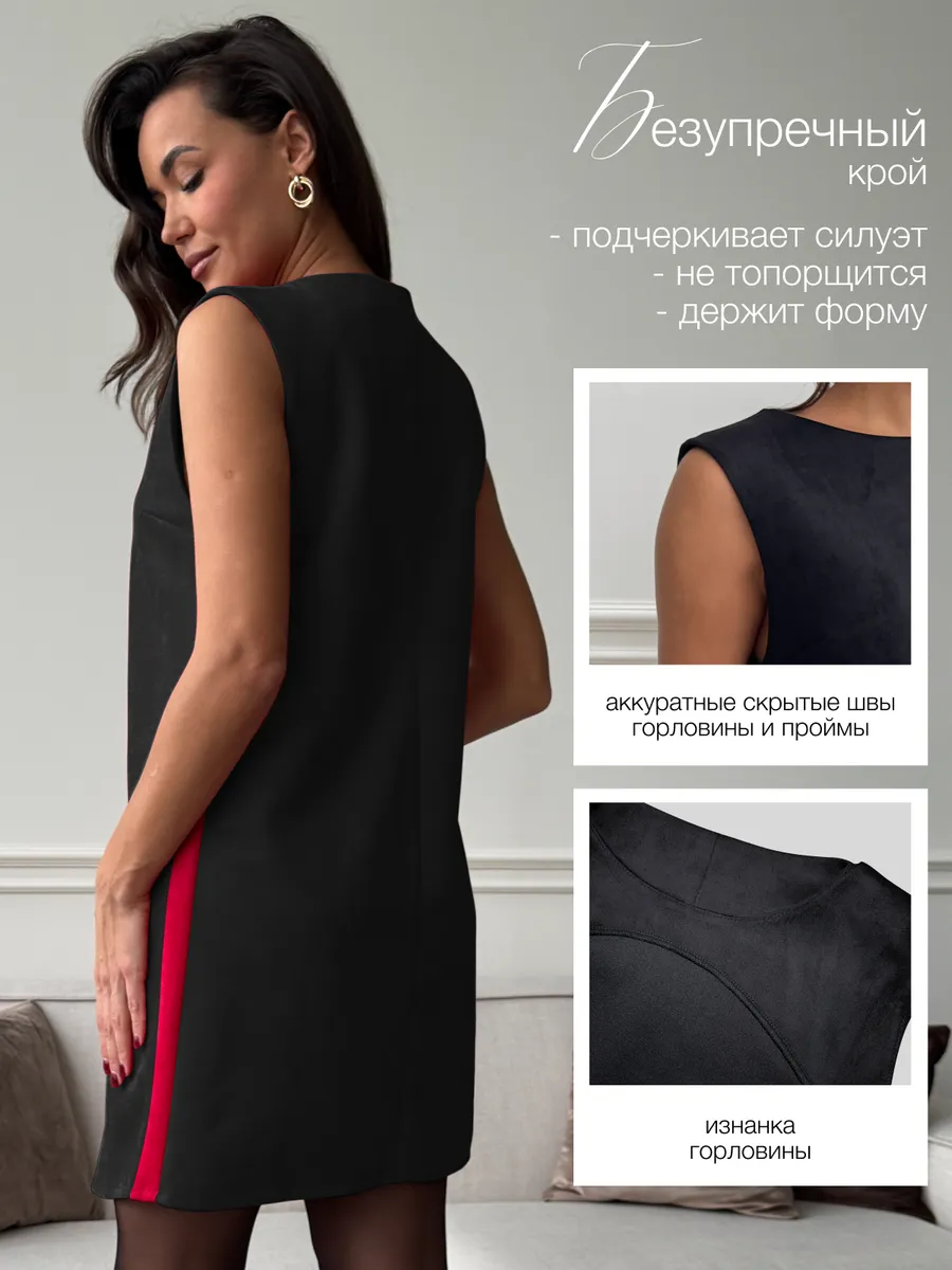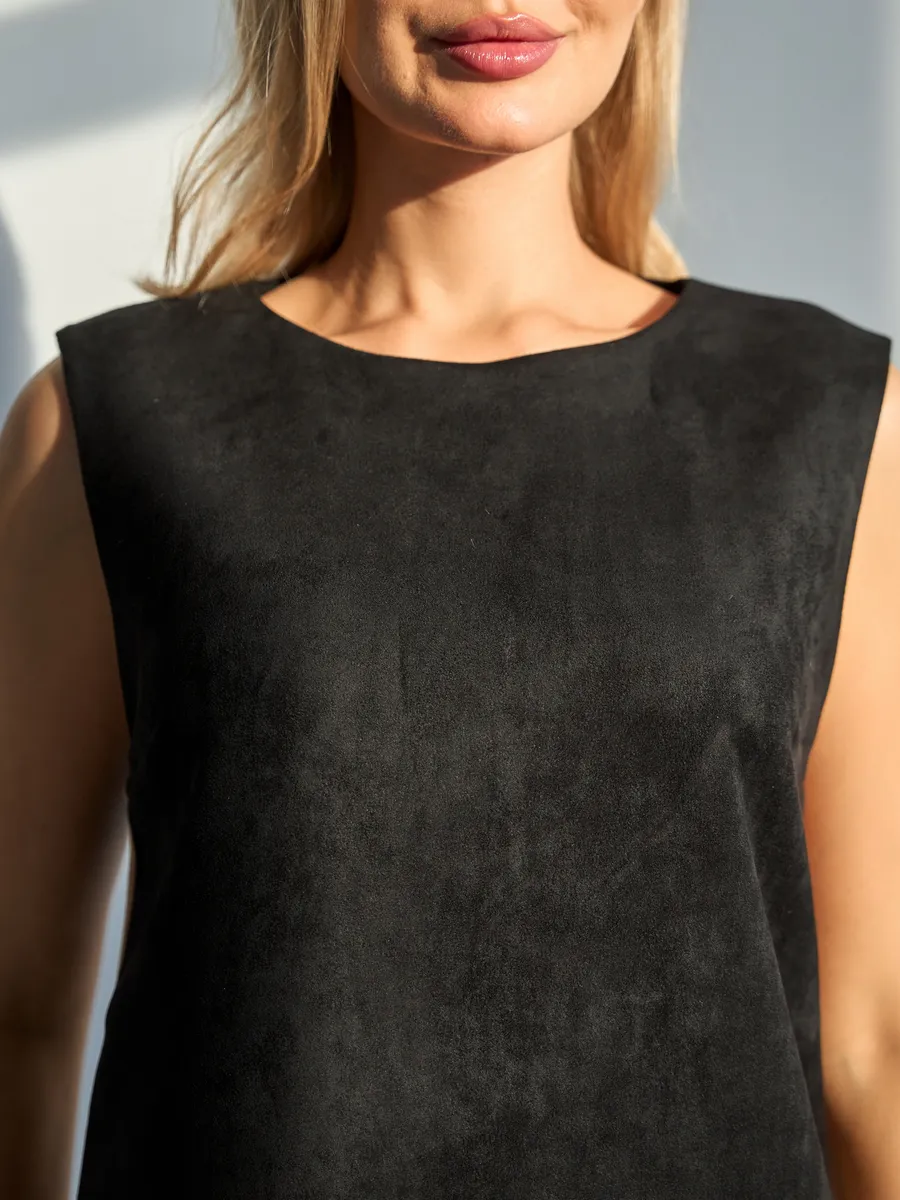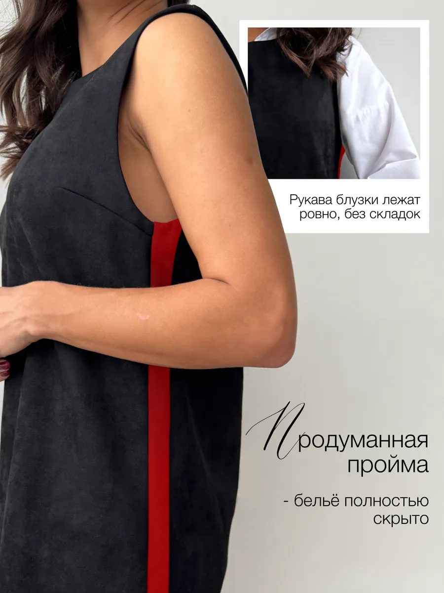 Тот самый сарафан – стильное замшевое платье сарафан без рукавов с открытыми плечами — универсальное женское платье для учебы и офиса, встреч и корпоративов, повседневных и праздничных выходов, составления капсульных сетов. Благодаря продуманному свободному крою деловое платье-сарафан с лёгким А-силуэтом «трапеция» комфортно сидит на фигуре и подчёркивает достоинства. Модель подходит как для высоких, так и для невысоких девушек, а длина может выглядеть как мини или как мягкое миди ниже колена в зависимости от размера. Идеальный выбор для зимнего и весеннего сезона 2026 года.