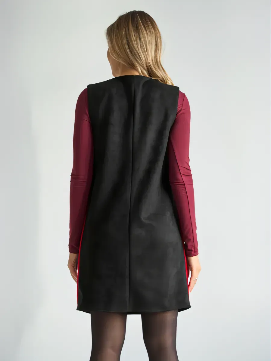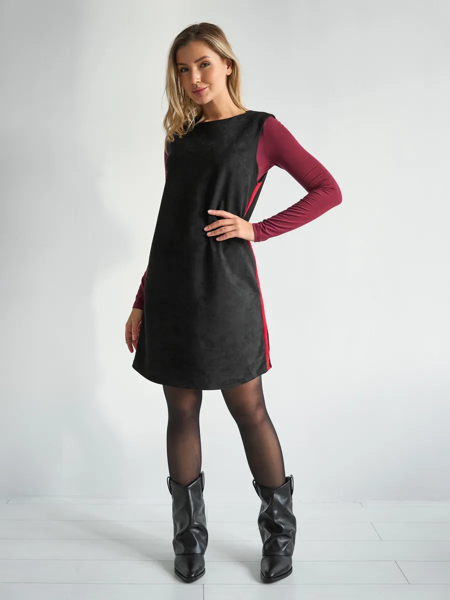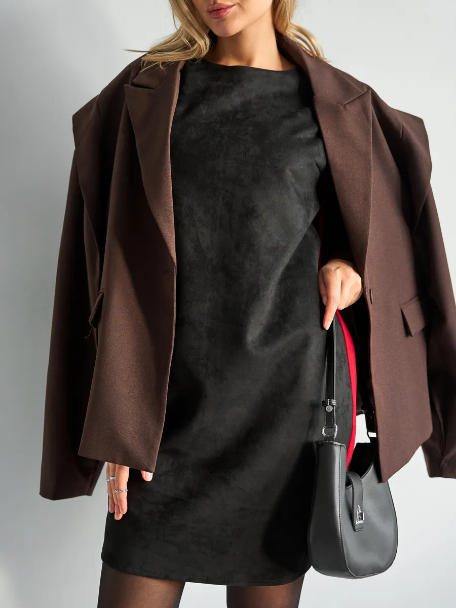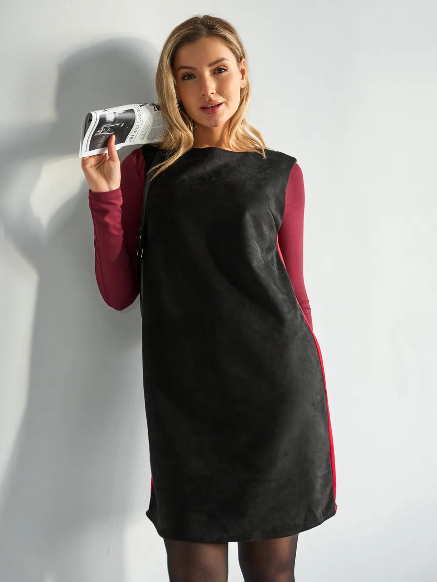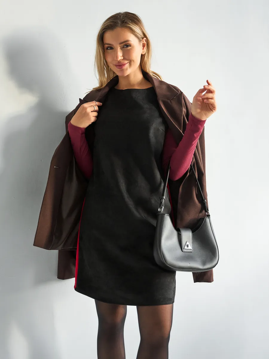 Тот самый сарафан – стильное замшевое платье сарафан без рукавов с открытыми плечами — универсальное женское платье для учебы и офиса, встреч и корпоративов, повседневных и праздничных выходов, составления капсульных сетов. Благодаря продуманному свободному крою деловое платье-сарафан с лёгким А-силуэтом «трапеция» комфортно сидит на фигуре и подчёркивает достоинства. Модель подходит как для высоких, так и для невысоких девушек, а длина может выглядеть как мини или как мягкое миди ниже колена в зависимости от размера. Идеальный выбор для зимнего и весеннего сезона 2026 года.