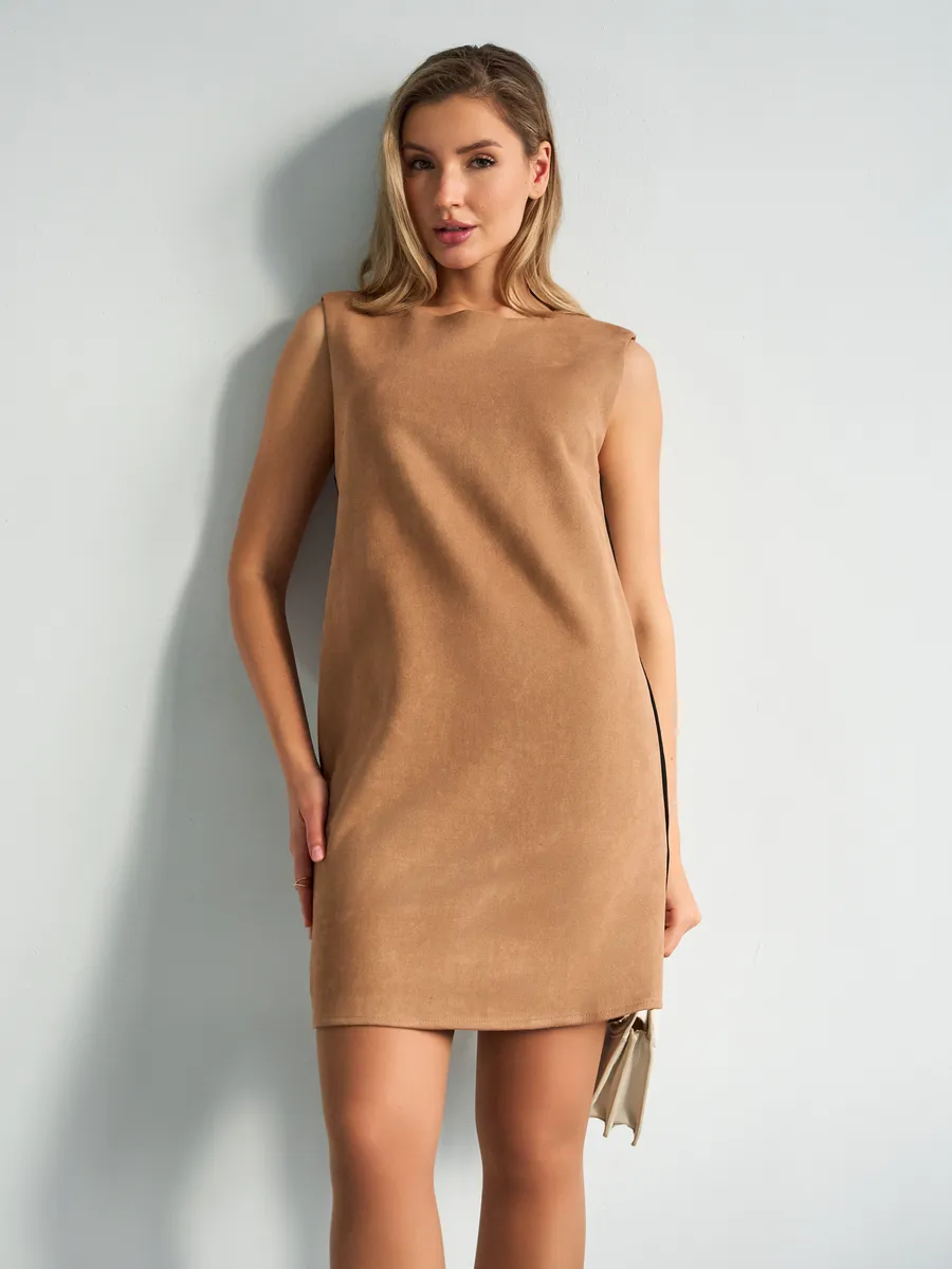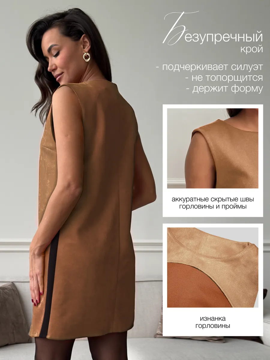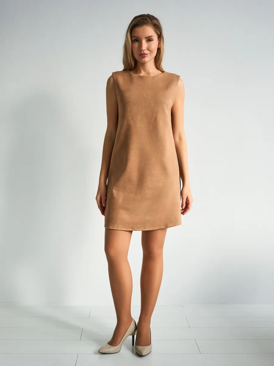 Тот самый сарафан – стильное замшевое платье сарафан без рукавов с открытыми плечами — универсальное женское платье для учебы и офиса, встреч и корпоративов, повседневных и праздничных выходов, составления капсульных сетов. Благодаря продуманному свободному крою деловое платье-сарафан с лёгким А-силуэтом «трапеция» комфортно сидит на фигуре и подчёркивает достоинства. Модель подходит как для высоких, так и для невысоких девушек, а длина может выглядеть как мини или как мягкое миди ниже колена в зависимости от размера. Идеальный выбор для зимнего и весеннего сезона 2026 года.