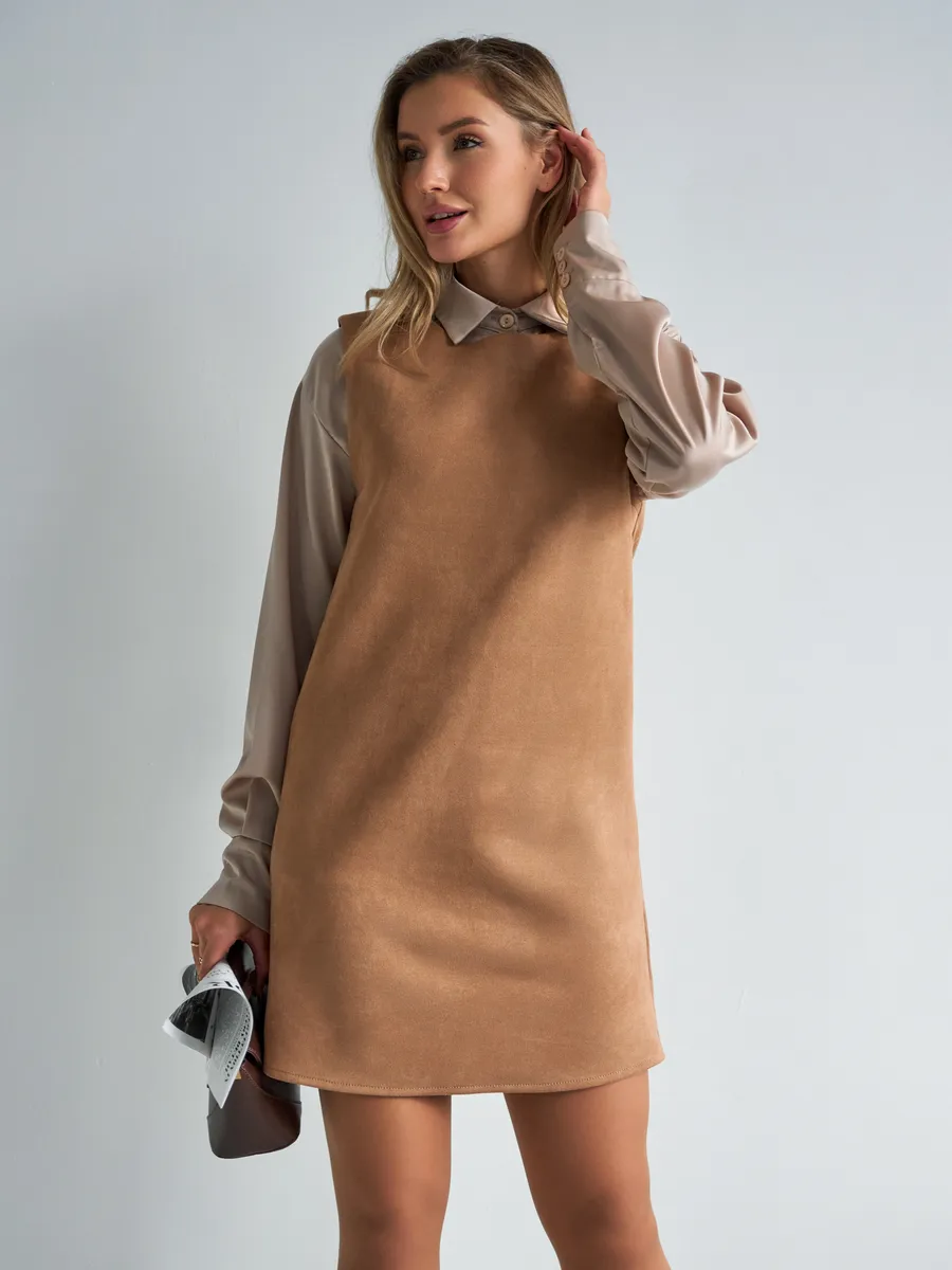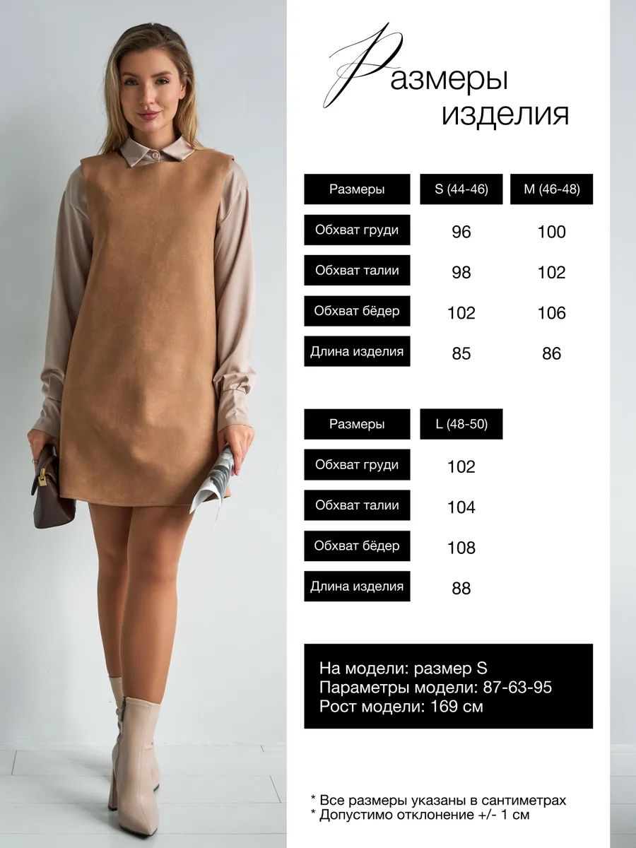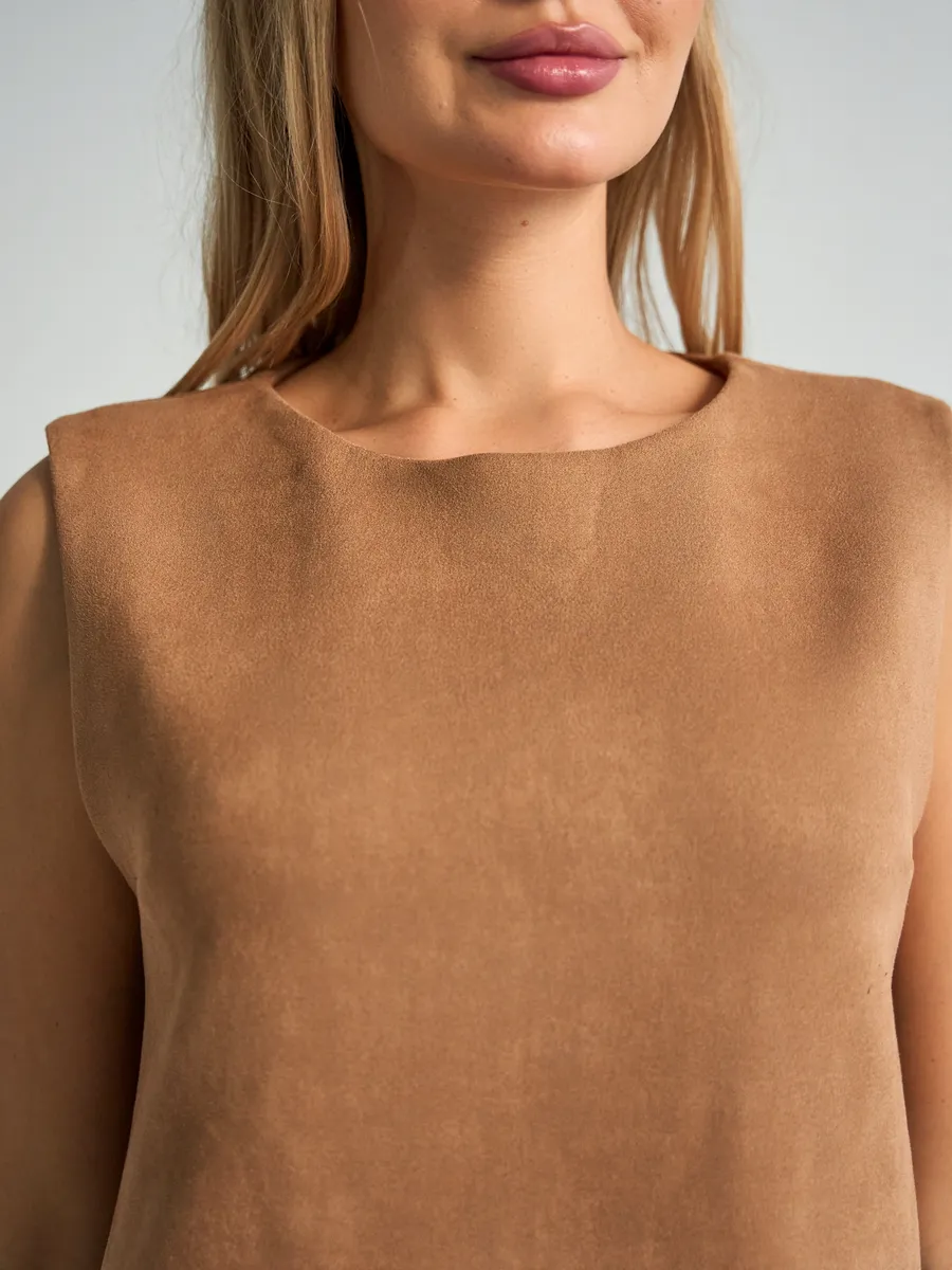Тот самый сарафан – стильное замшевое платье сарафан без рукавов с открытыми плечами — универсальное женское платье для учебы и офиса, встреч и корпоративов, повседневных и праздничных выходов, составления капсульных сетов. Благодаря продуманному свободному крою деловое платье-сарафан с лёгким А-силуэтом «трапеция» комфортно сидит на фигуре и подчёркивает достоинства. Модель подходит как для высоких, так и для невысоких девушек, а длина может выглядеть как мини или как мягкое миди ниже колена в зависимости от размера. Идеальный выбор для зимнего и весеннего сезона 2026 года.