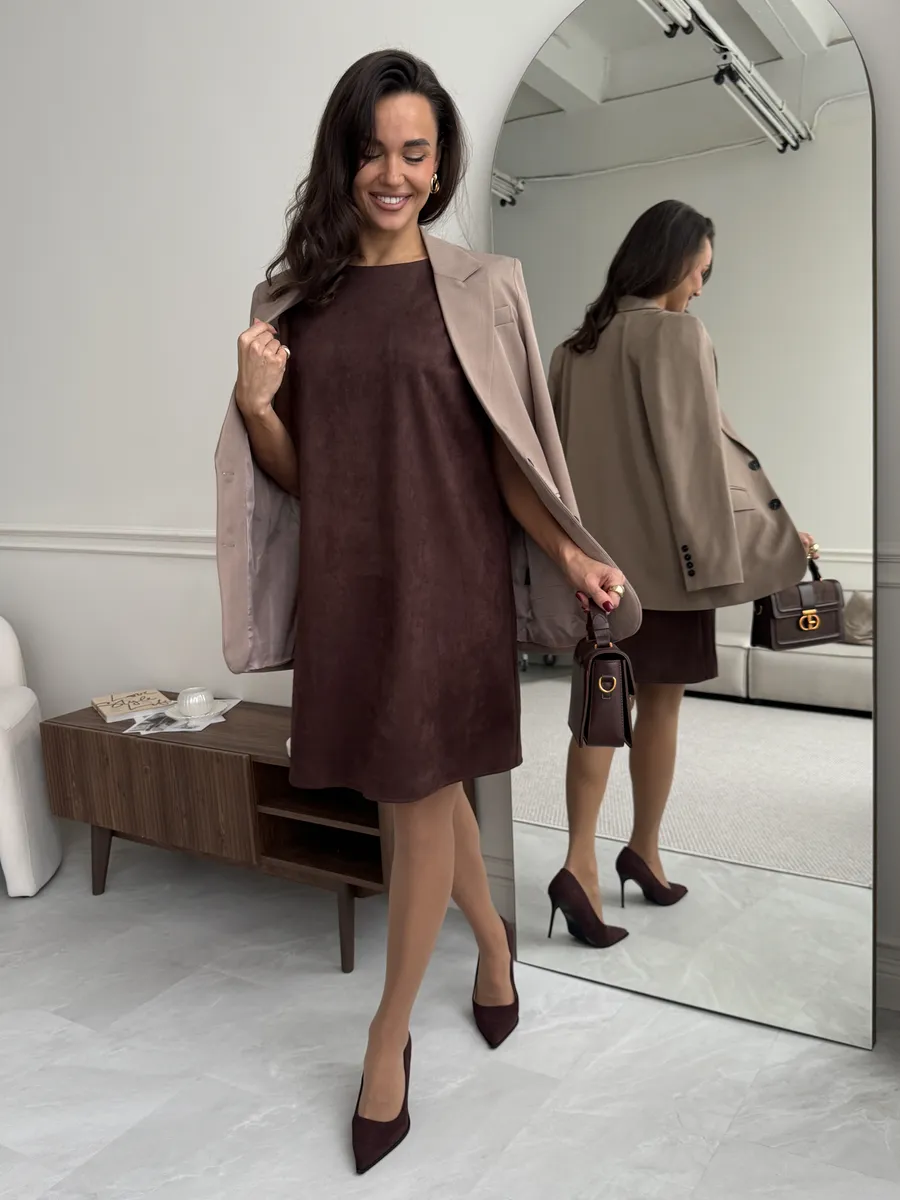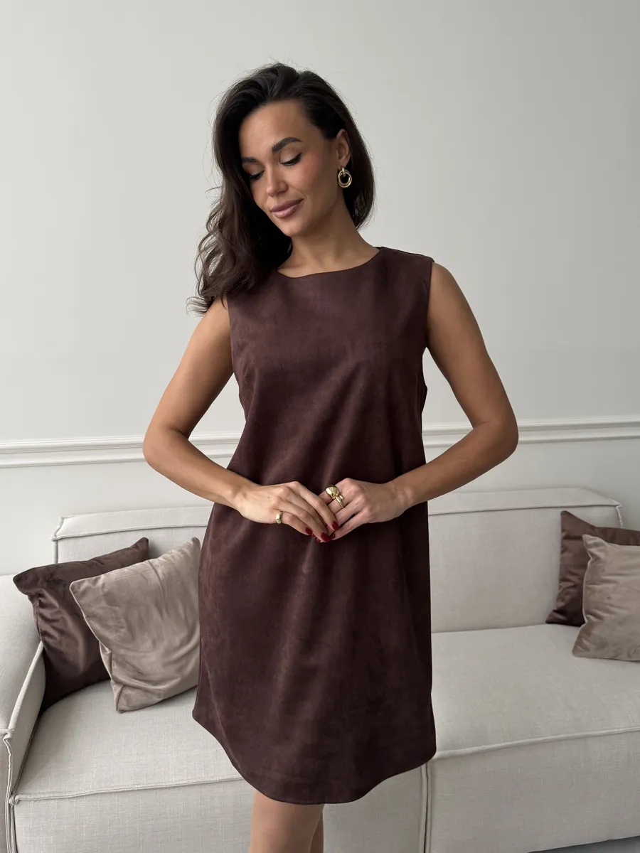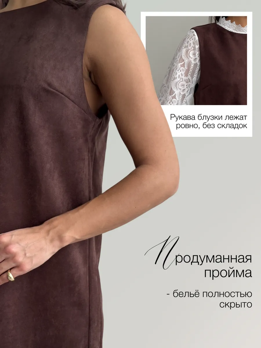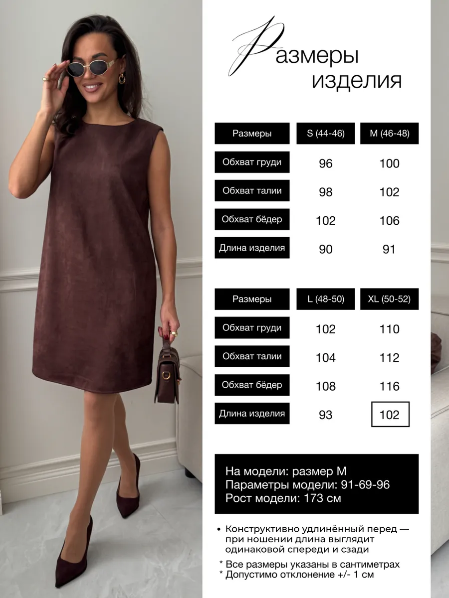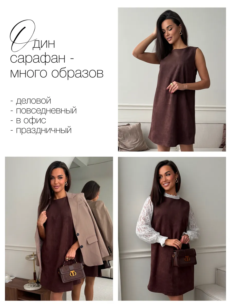 Благородный шоколадный оттенок подчёркивает глубину цвета и аккуратный силуэт модели и относится к числу актуальных трендов 2026 годов. Этот цвет часто называют «вторым чёрным» благодаря универсальности и лёгкости сочетаний практически с любой палитрой. Коричневая замша смотрится мягко и дорого, поддерживая эстетику тихой роскоши. Такой сарафан гармонично вписывается в офисные и повседневные образы, а также в капсульные гардеробы. С каблуками и украшениями модель легко трансформируется в элегантный вечерний, коктейльный или праздничный образ для корпоратива, Нового года, 14 февраля или 8 Марта. Будьте неотразимы каждый день!