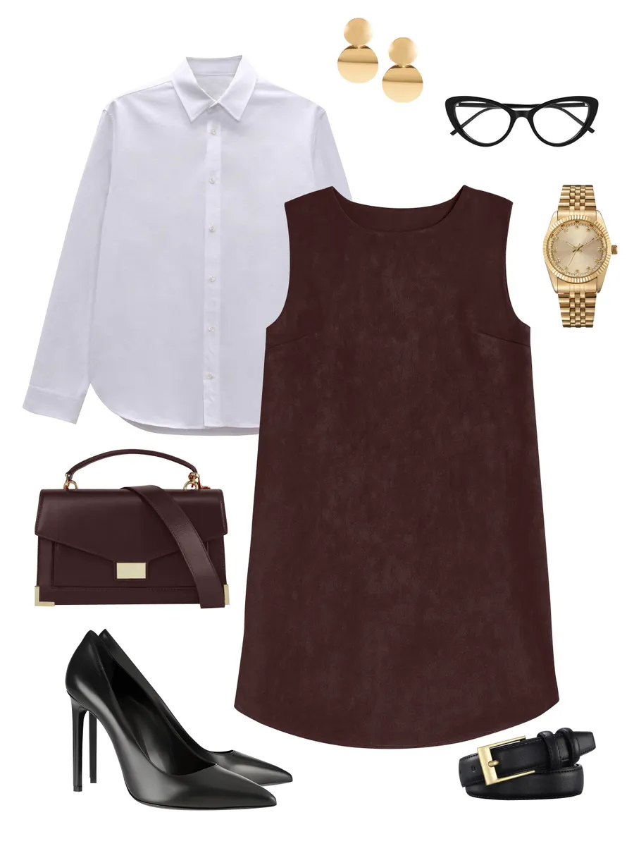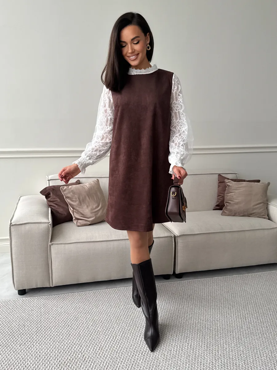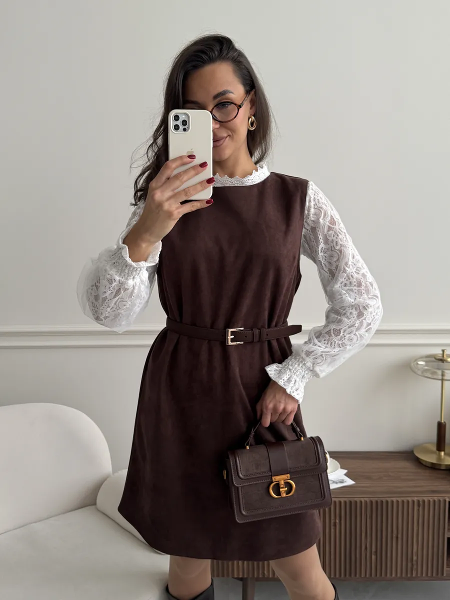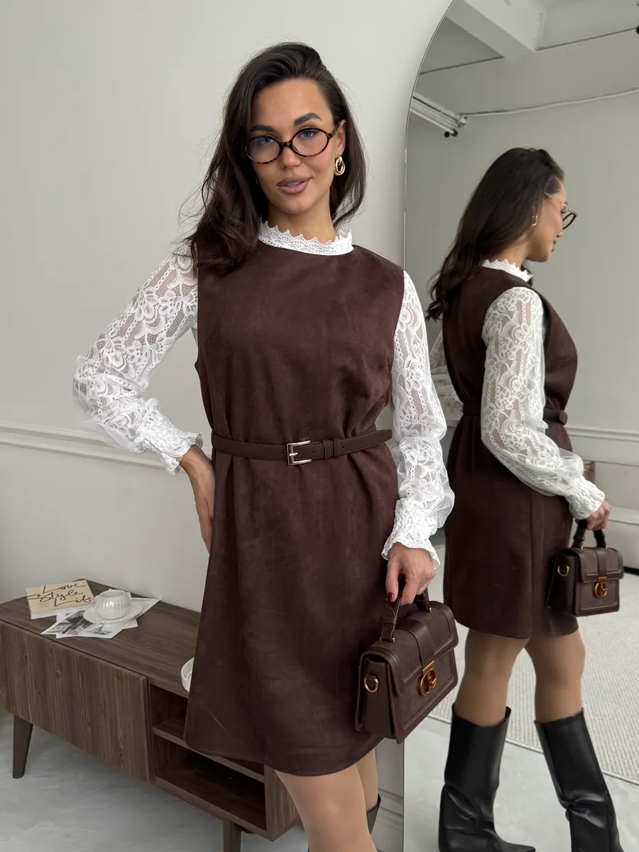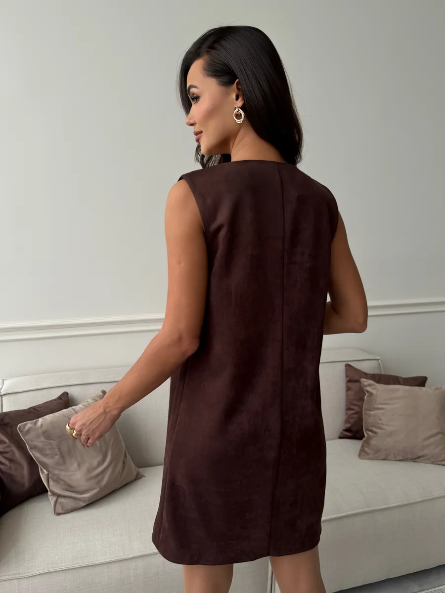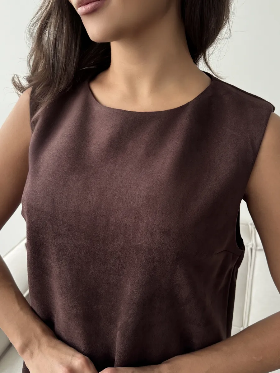 Благородный шоколадный оттенок подчёркивает глубину цвета и аккуратный силуэт модели и относится к числу актуальных трендов 2026 годов. Этот цвет часто называют «вторым чёрным» благодаря универсальности и лёгкости сочетаний практически с любой палитрой. Коричневая замша смотрится мягко и дорого, поддерживая эстетику тихой роскоши. Такой сарафан гармонично вписывается в офисные и повседневные образы, а также в капсульные гардеробы. С каблуками и украшениями модель легко трансформируется в элегантный вечерний, коктейльный или праздничный образ для корпоратива, Нового года, 14 февраля или 8 Марта. Будьте неотразимы каждый день!