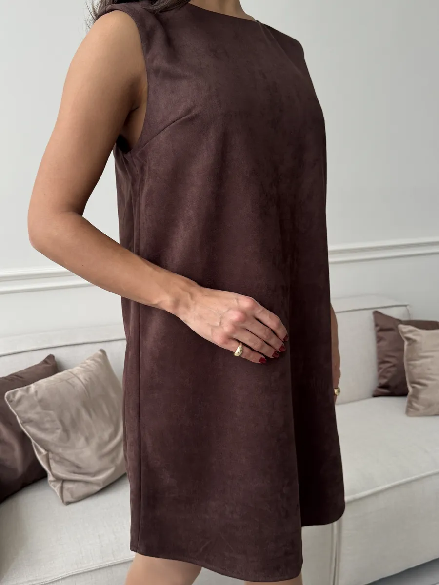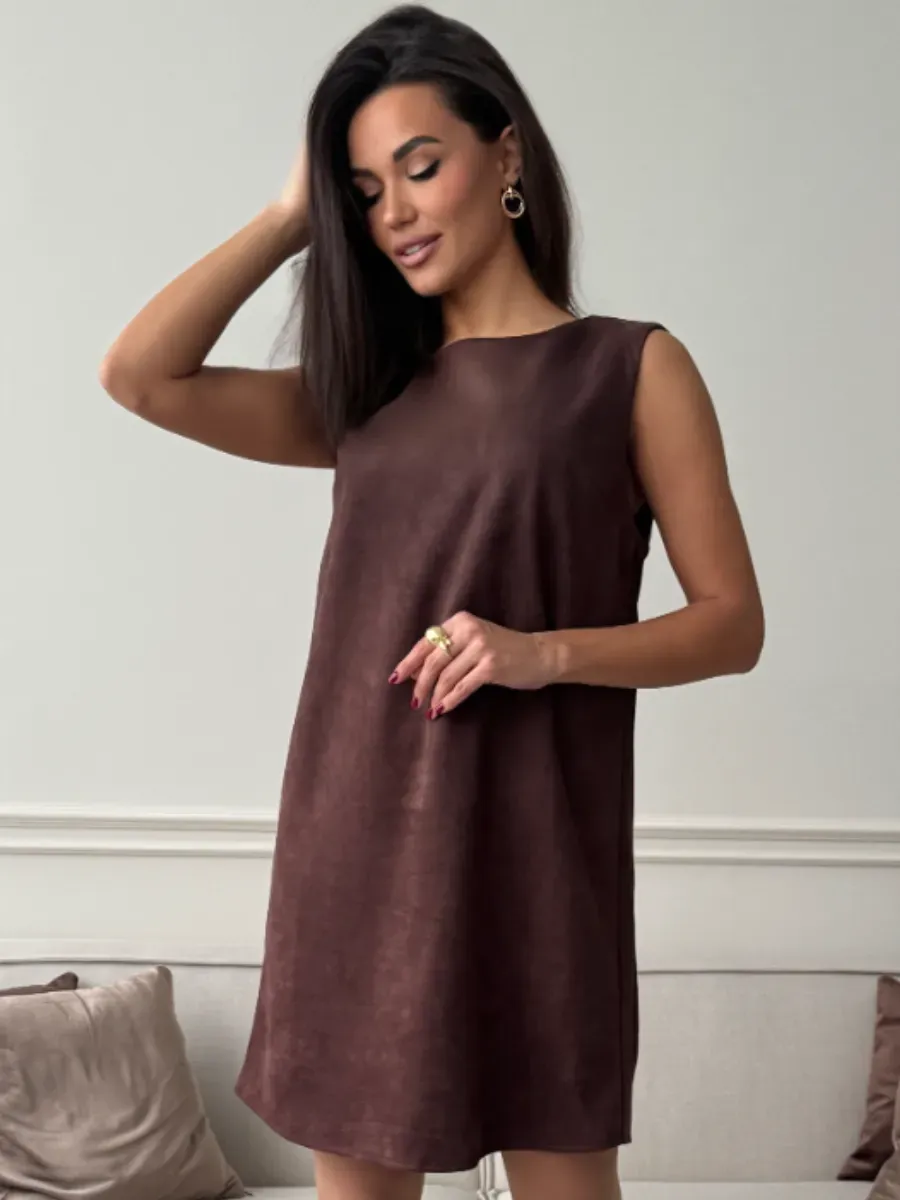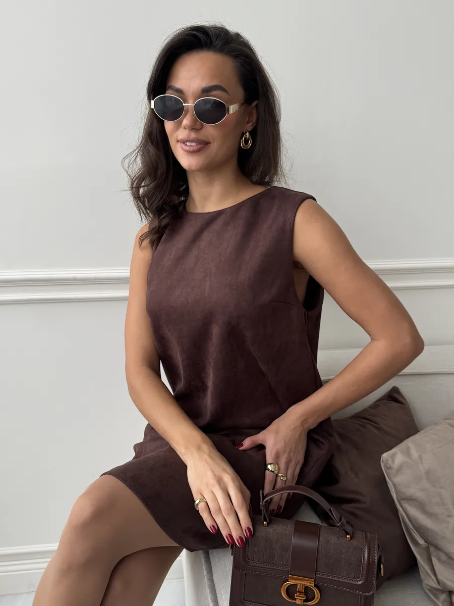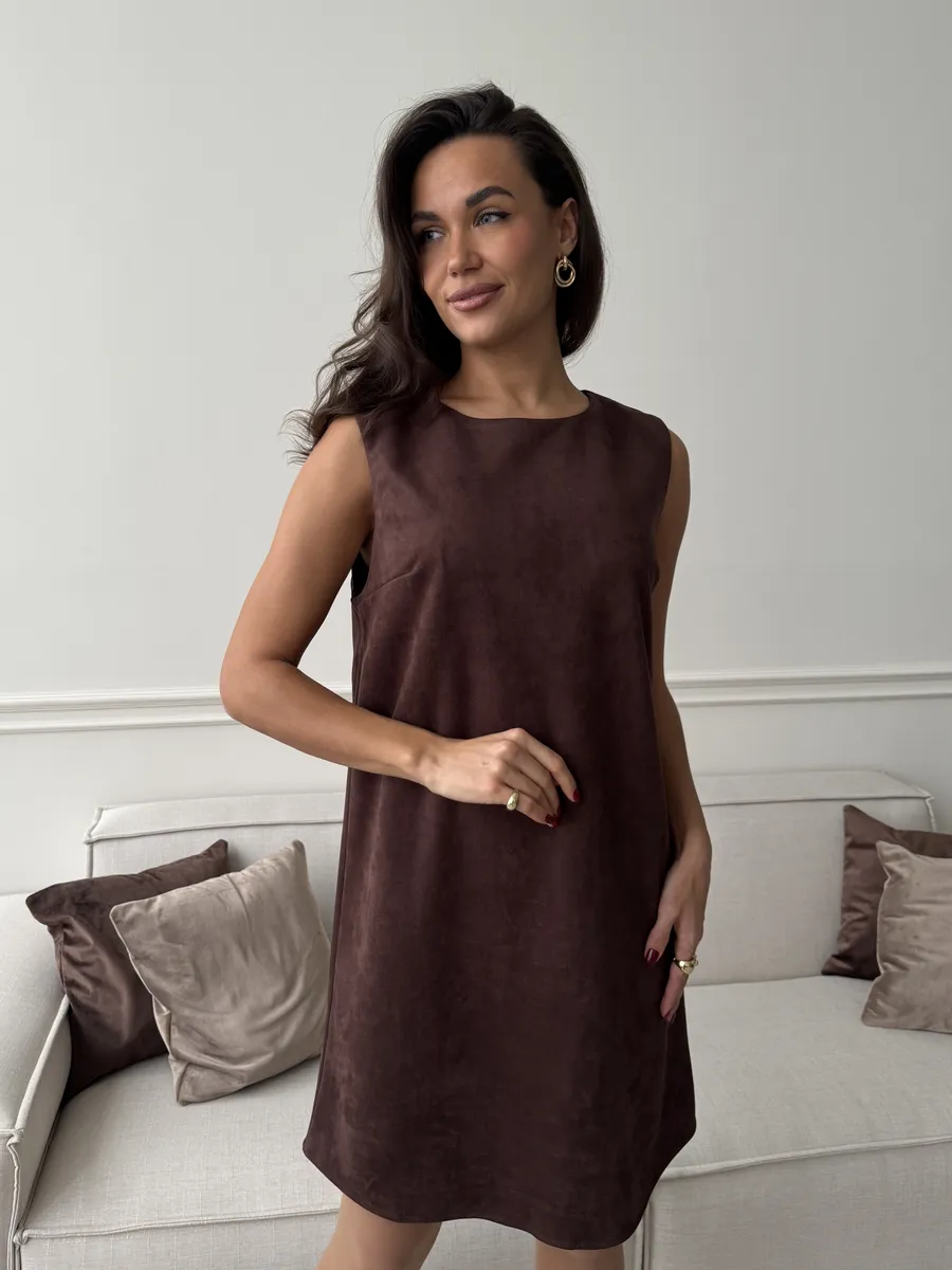 Тот самый сарафан – стильное замшевое платье сарафан без рукавов с открытыми плечами — универсальное женское платье для учебы и офиса, встреч и корпоративов, повседневных и праздничных выходов, составления капсульных сетов. Благодаря продуманному свободному крою деловое платье-сарафан с лёгким А-силуэтом «трапеция» комфортно сидит на фигуре и подчёркивает достоинства. Модель подходит как для высоких, так и для невысоких девушек, а длина может выглядеть как мини или как мягкое миди ниже колена в зависимости от размера. Идеальный выбор для зимнего и весеннего сезона 2026 года.
