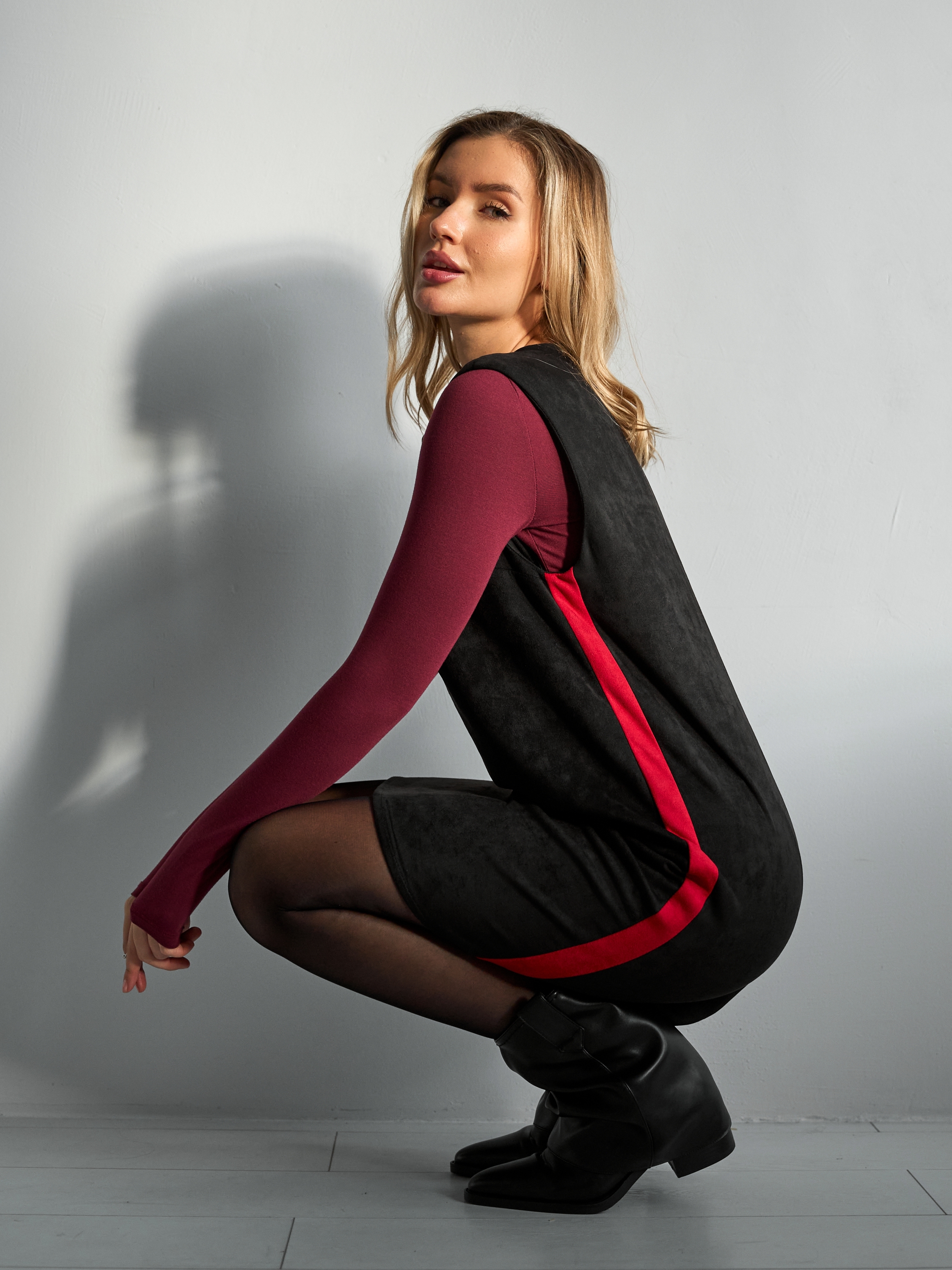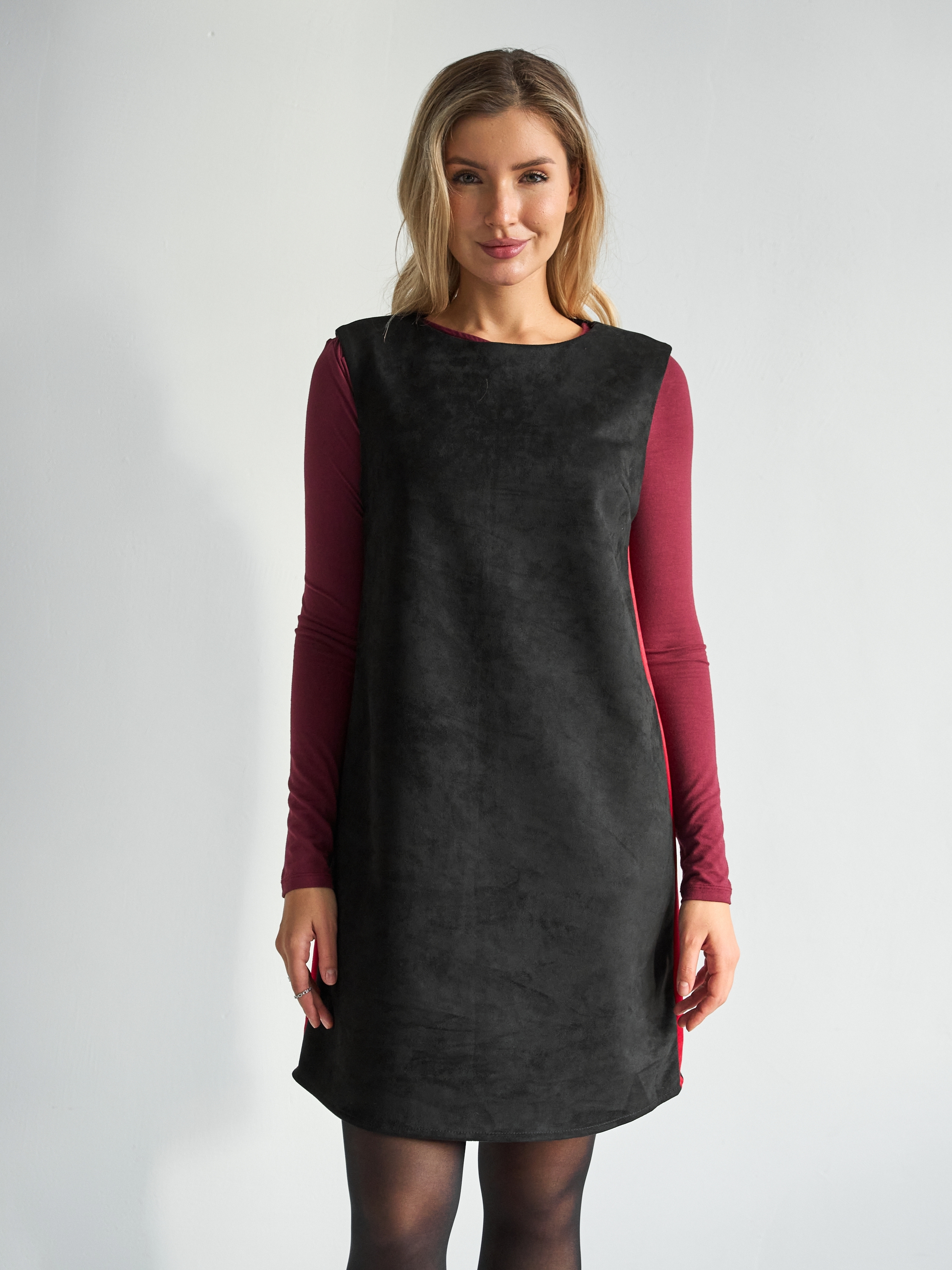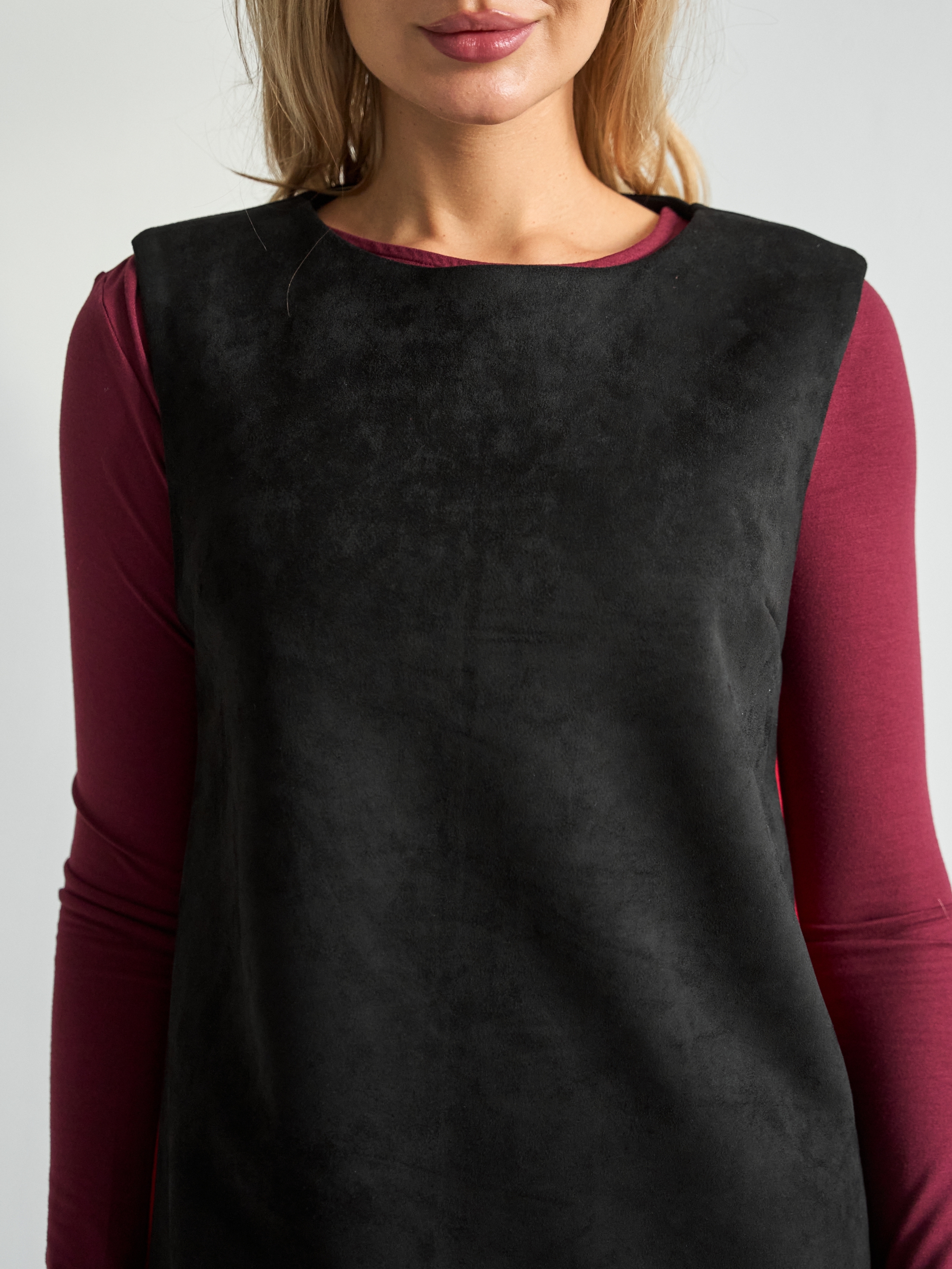 Сарафан деловой смотрится модно и актуально в осенний и зимний сезон. Теплый материал делает его отличным вариантом для демисезонного гардероба, а классический фасон подойдет как для офиса, так и для школы. Универсальный короткий сарафан из экозамши легко комбинируется с любым верхом, позволяя создавать уникальные женственные образы.