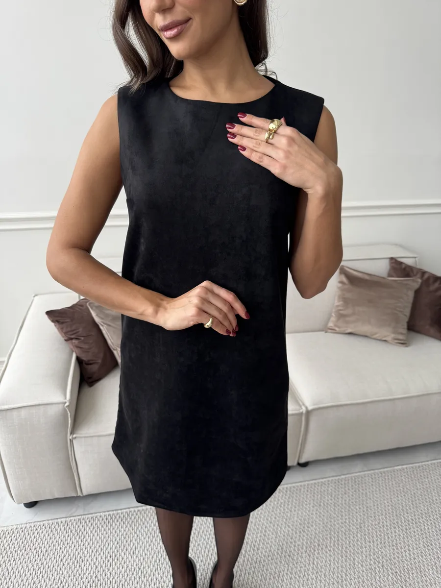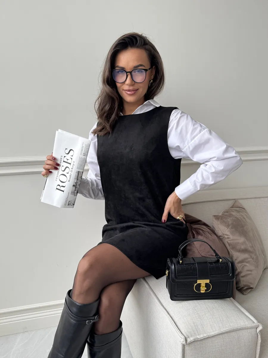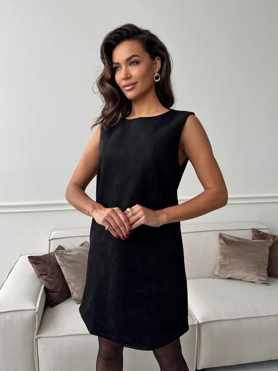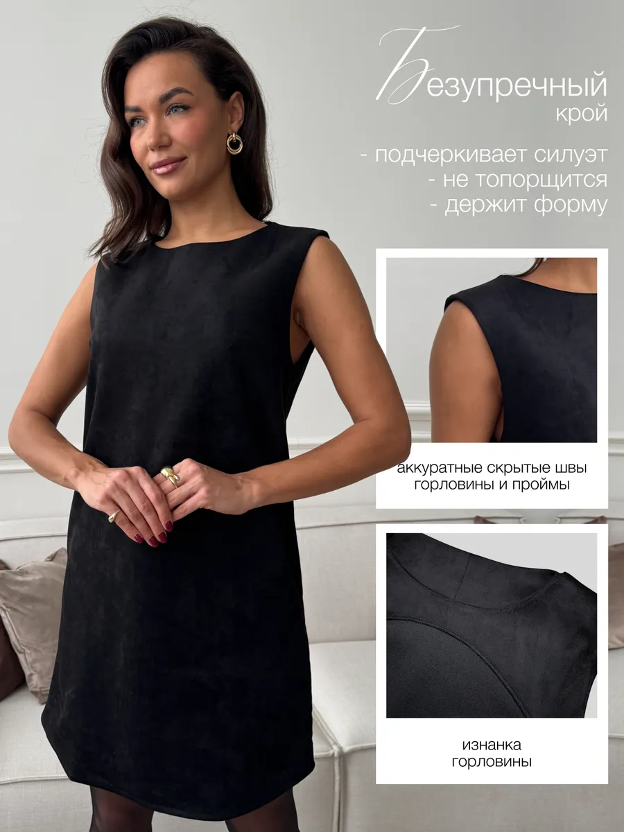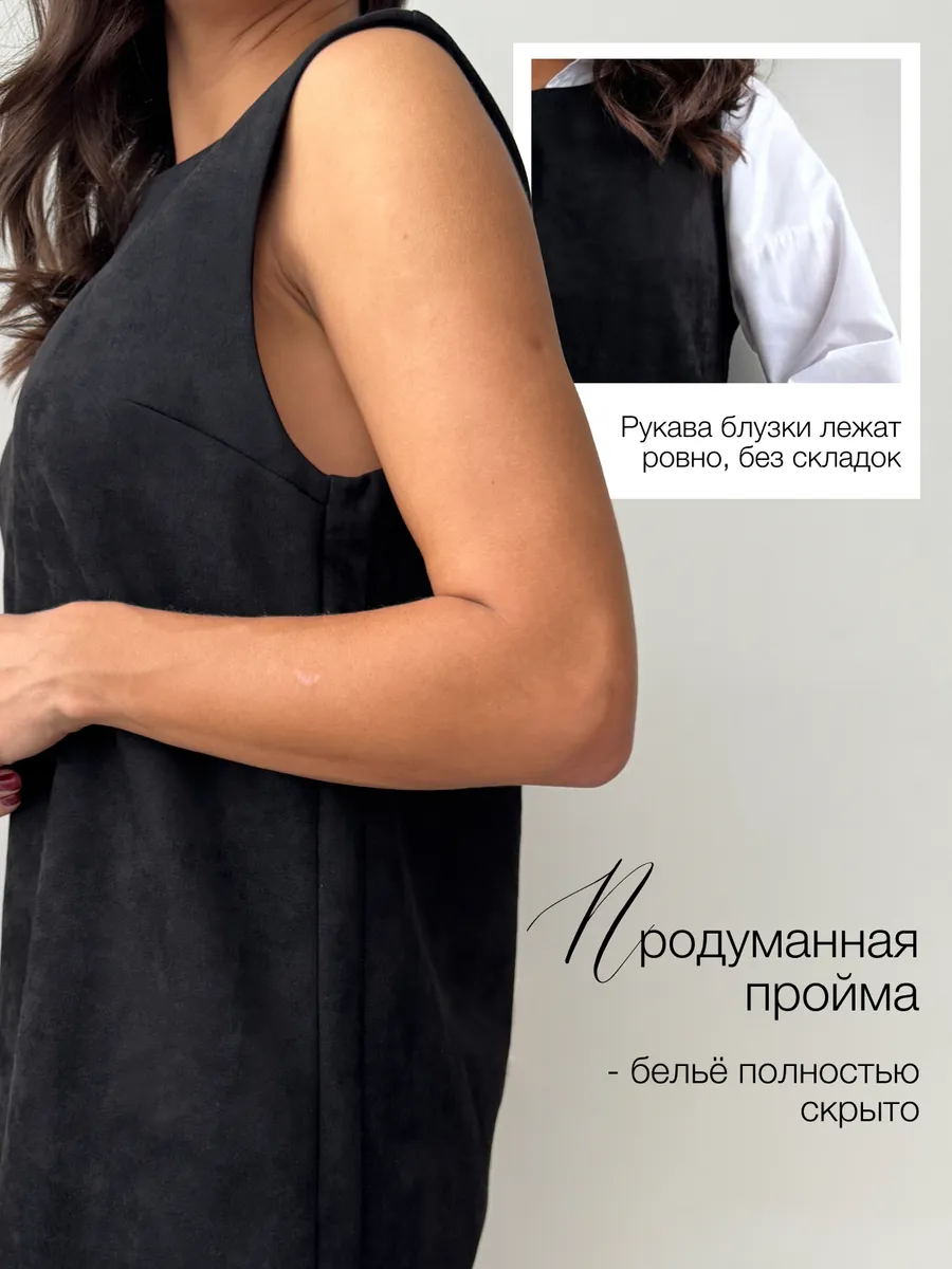 Тот самый сарафан – стильное замшевое платье сарафан без рукавов с открытыми плечами — универсальное женское платье для учебы и офиса, встреч и корпоративов, повседневных и праздничных выходов, составления капсульных сетов. Благодаря продуманному свободному крою деловое платье-сарафан с лёгким А-силуэтом «трапеция» комфортно сидит на фигуре и подчёркивает достоинства. Модель подходит как для высоких, так и для невысоких девушек, а длина может выглядеть как мини или как мягкое миди ниже колена в зависимости от размера. Идеальный выбор для зимнего и весеннего сезона 2026 года.