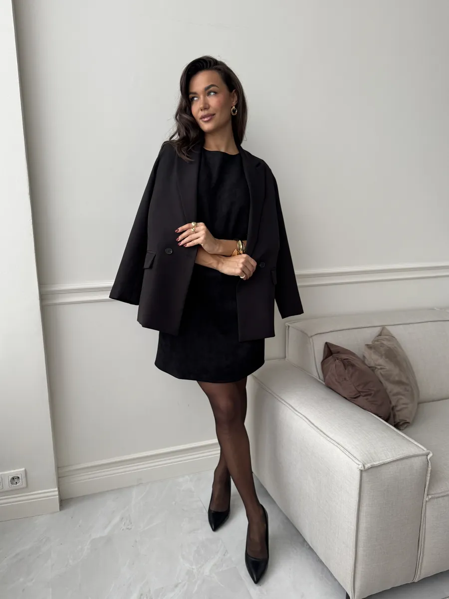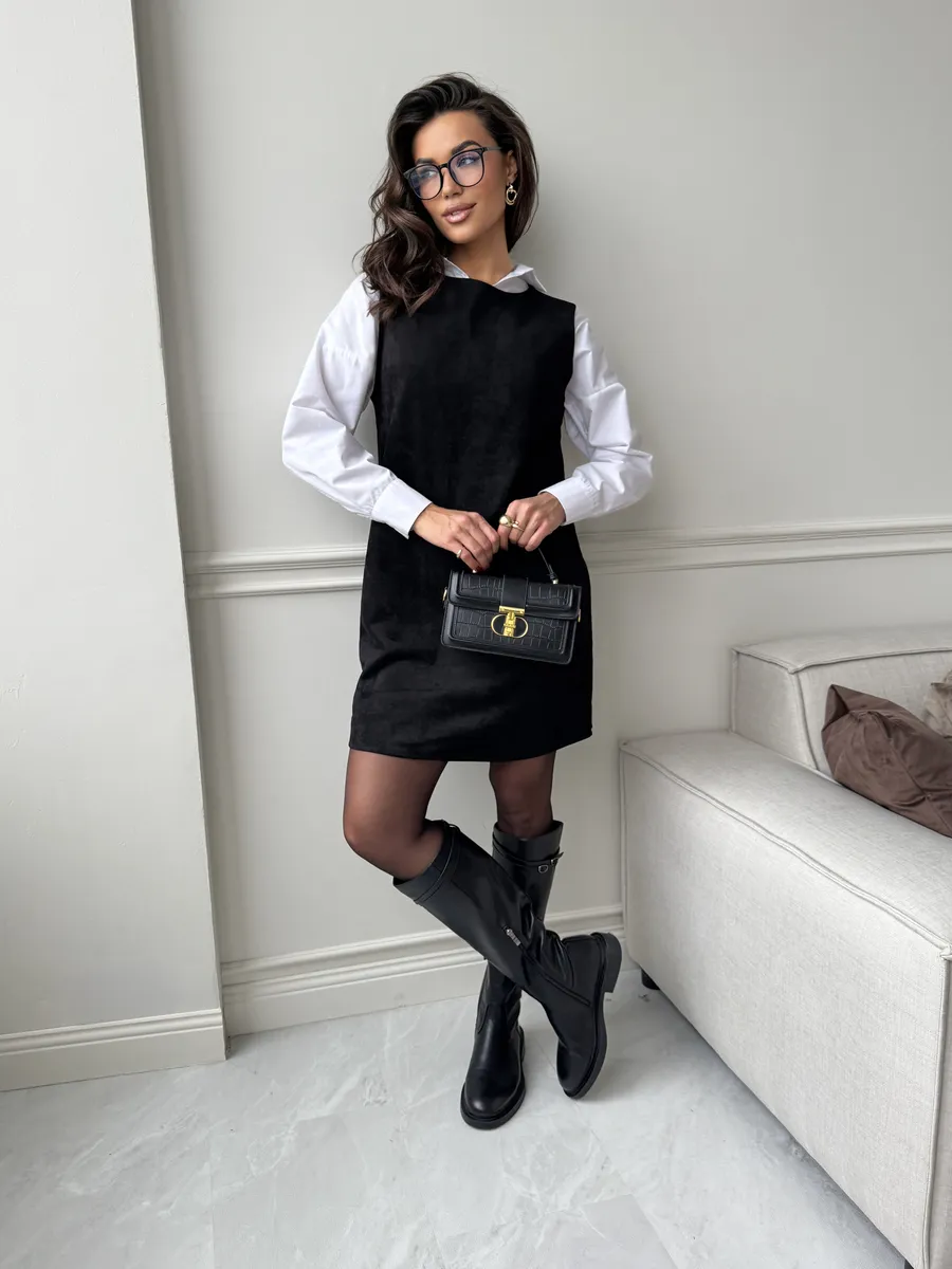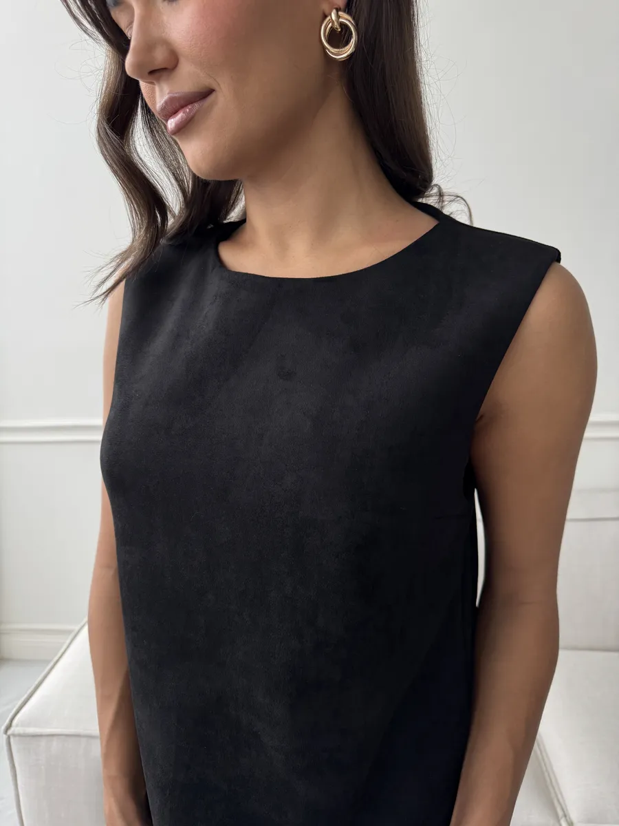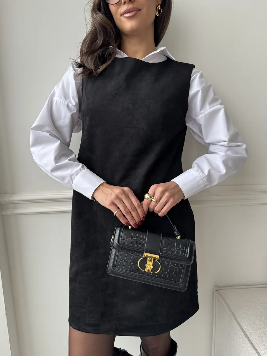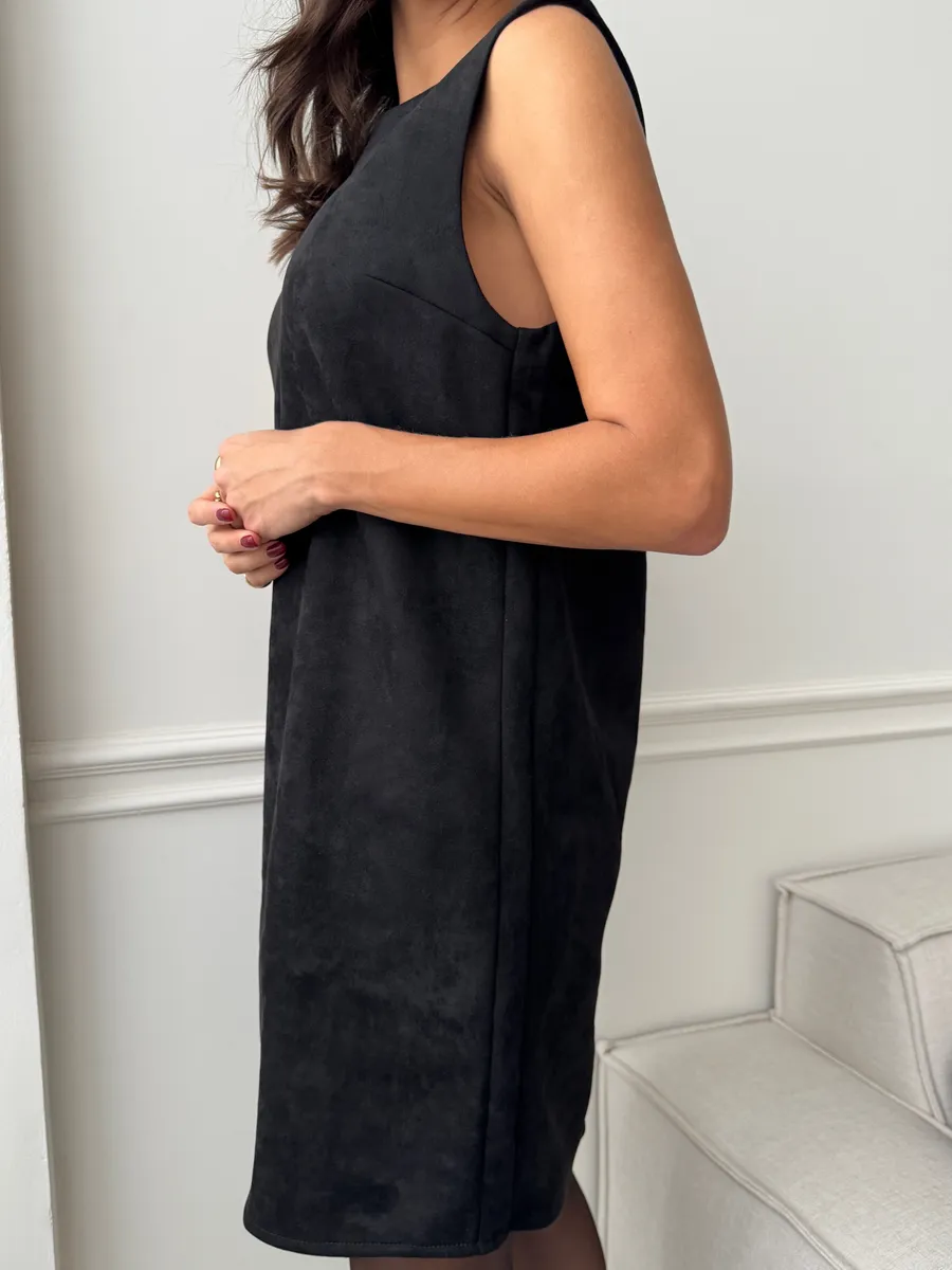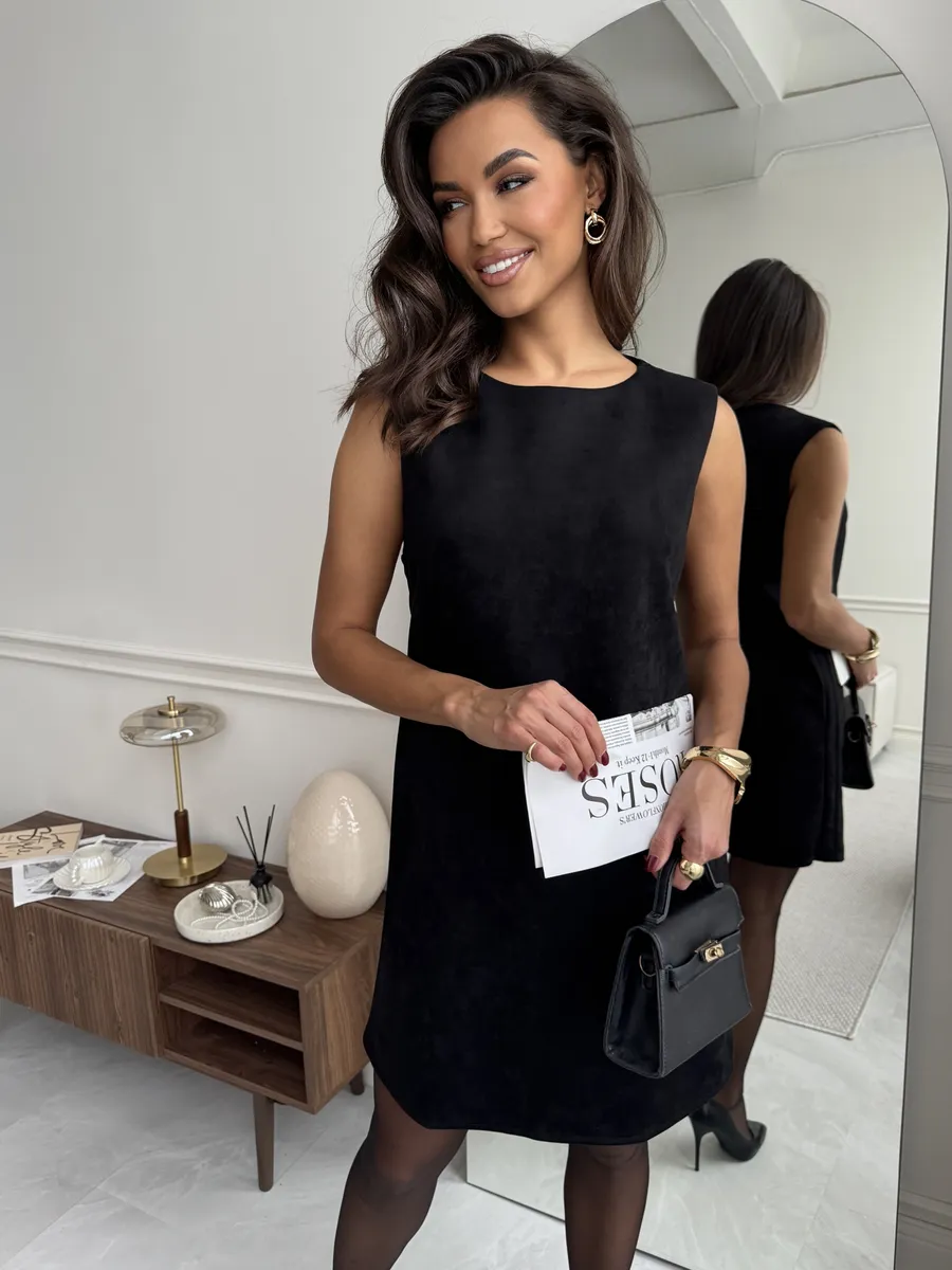 Тот самый сарафан – стильное замшевое платье сарафан без рукавов с открытыми плечами — универсальное женское платье для учебы и офиса, встреч и корпоративов, повседневных и праздничных выходов, составления капсульных сетов. Благодаря продуманному свободному крою деловое платье-сарафан с лёгким А-силуэтом «трапеция» комфортно сидит на фигуре и подчёркивает достоинства. Модель подходит как для высоких, так и для невысоких девушек, а длина может выглядеть как мини или как мягкое миди ниже колена в зависимости от размера. Идеальный выбор для зимнего и весеннего сезона 2026 года.